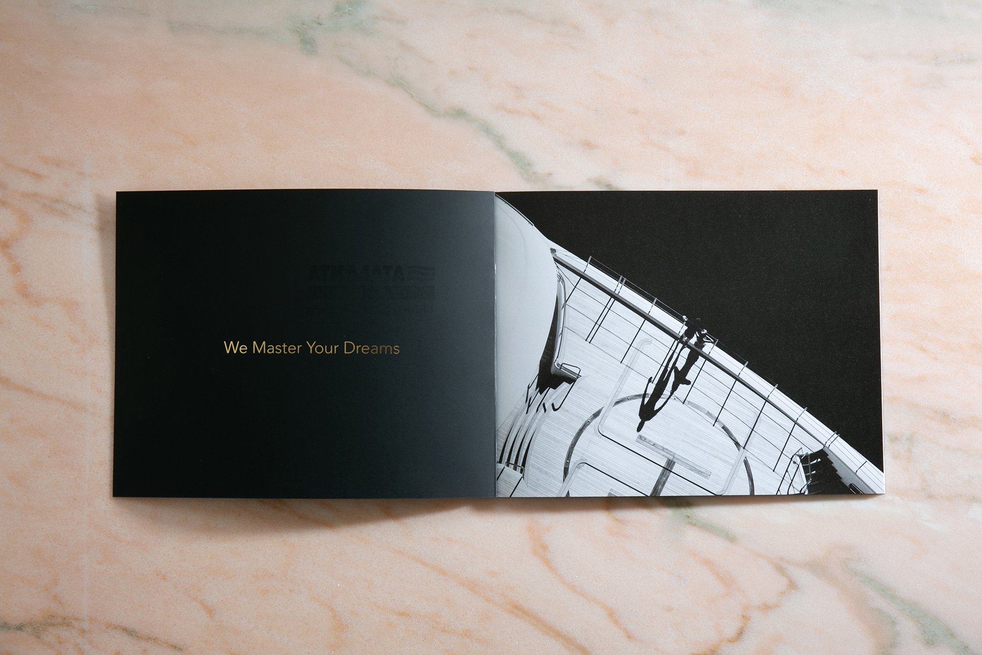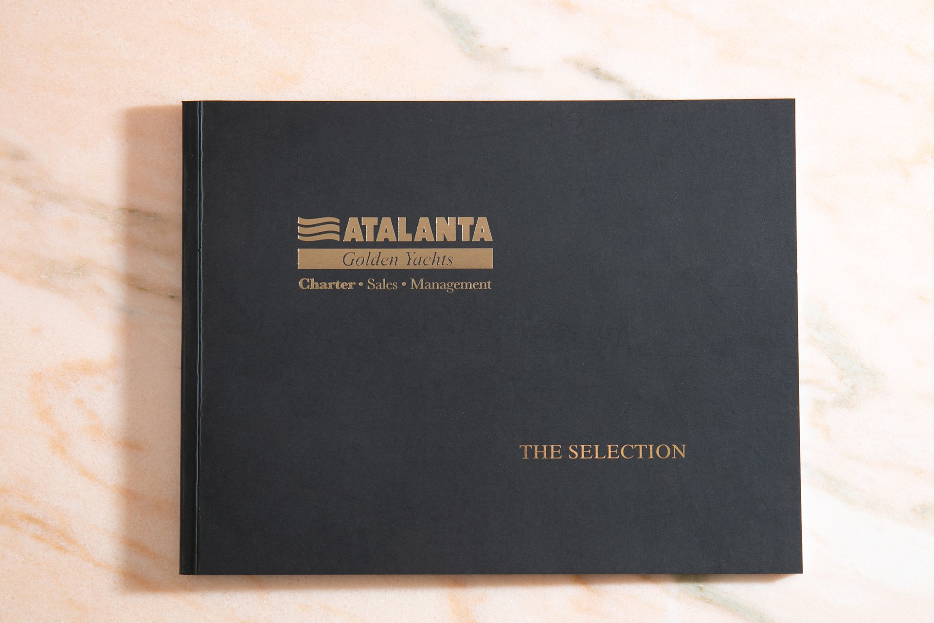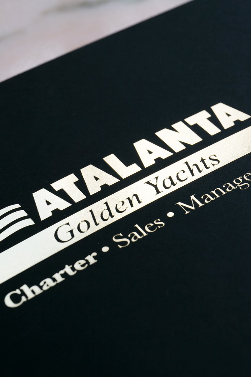 Πολυσέλιδος κατάλογος για ενοικιάσεις πολυτελών σκαφών, τυπωμένος σε premium λευκό ματ χαρτί με υψηλής ποιότητας τετραχρωμία (CMYK) offset. Εμπλουτισμένος με μεταλλικό χρυσό spot χρώμα, αποπνέει κομψότητα και εκλεπτυσμένη πολυτέλεια. Το μπροστινό εξώφυλλο είναι λαμιναρισμένο (duplex) με χρυσή, ανάγλυφη δερματίνη, ενισχύοντας τον premium χαρακτήρα της έκδοσης.