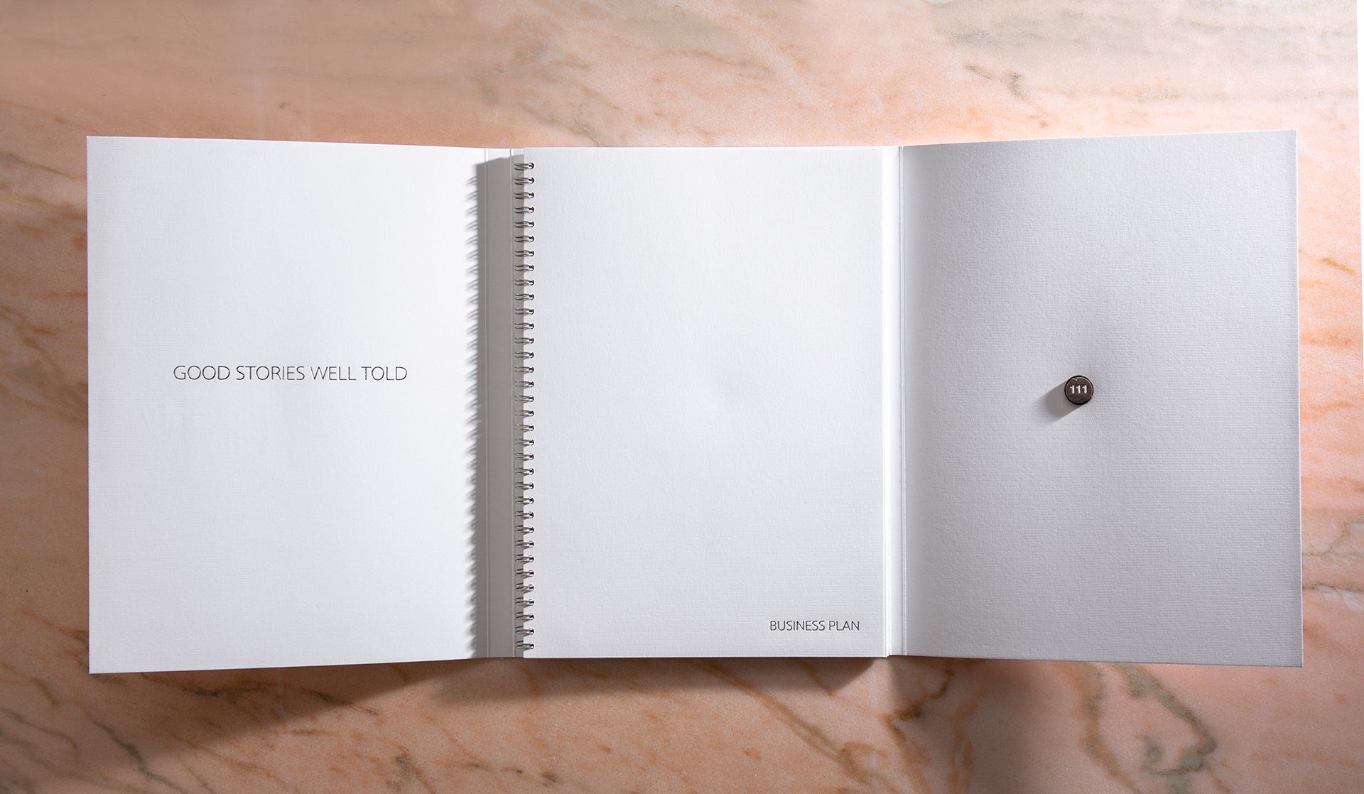 Τρίπτυχη παρουσίαση–φάκελος, σχεδιασμένη για να φιλοξενεί το booklet του επιχειρηματικού πλάνου. Όλοι οι τίτλοι αποτυπώνονται με ασημένια θερμοτυπία, προσδίδοντας κομψό και επαγγελματικό χαρακτήρα. Το booklet είναι σπιράλ βιβλιοδετημένο, εξασφαλίζοντας ευκολία στη χρήση και αντοχή.