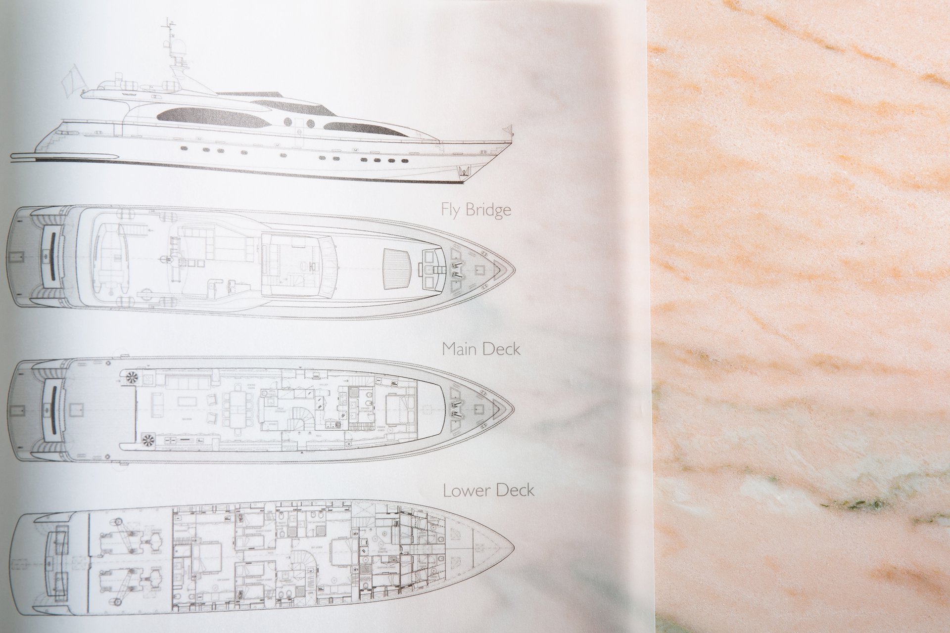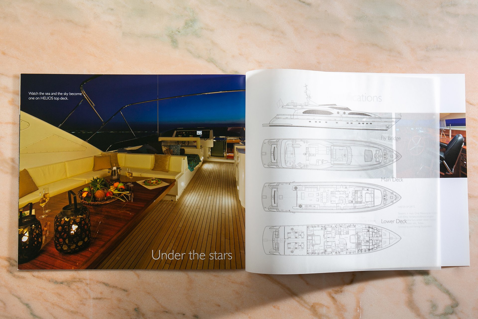 Τετράγωνο φυλλάδιο για πολυτελές μηχανοκίνητο σκάφος, τυπωμένο με υψηλής ποιότητας τετραχρωμία (CMYK) offset και φινιρισμένο με τοπικό UV βερνίκι, που αναδεικνύει επιλεγμένες λεπτομέρειες και προσδίδει εκλεπτυσμένη, premium αισθητική.