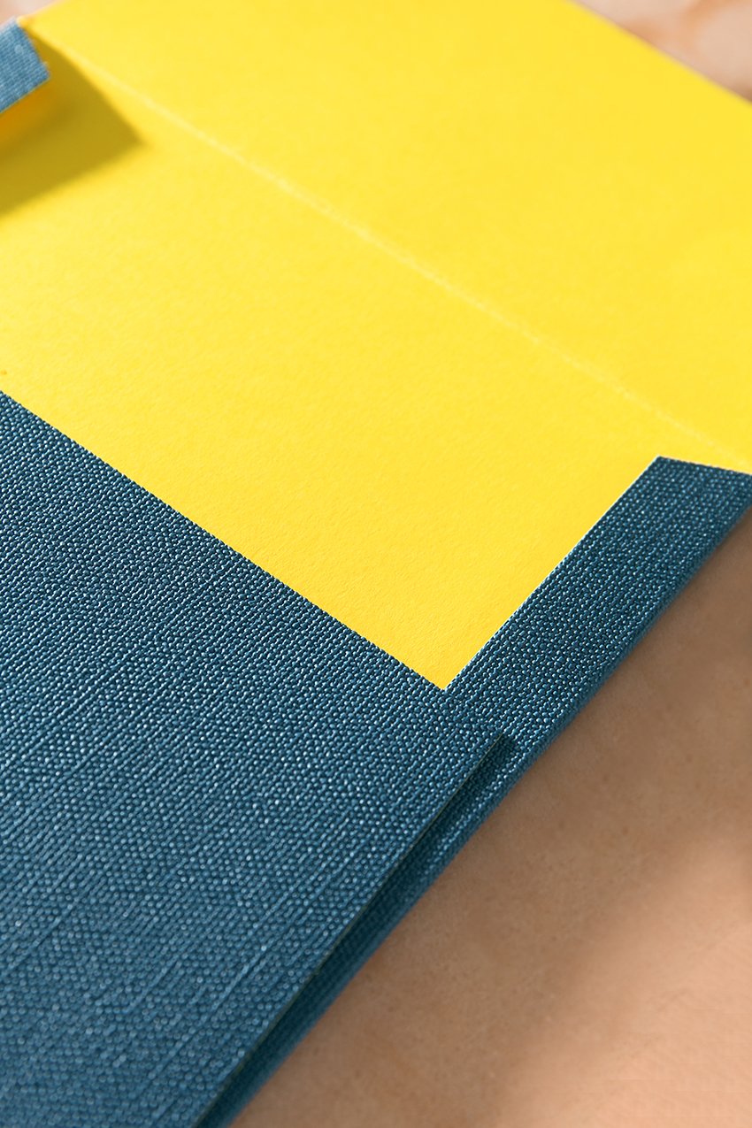 Όρθιος φάκελος με καρέ κλείσιμο από μπλε δερματίνη εξωτερικά, λαμιναρισμένο εσωτερικά με κίτρινο χαρτί. Η κάρτα εσωτερικά είναι λαμιναρισμένη στα 780γρ από λευκό χαρτί με ιδιαίτερη υφή. Στην μία όψη είναι εκτυπωμένο, τετράχρωμο, offset ζωγραφικό έργο ενώ από την άλλη το κείμενο είναι με μπλε θερμογραφία.