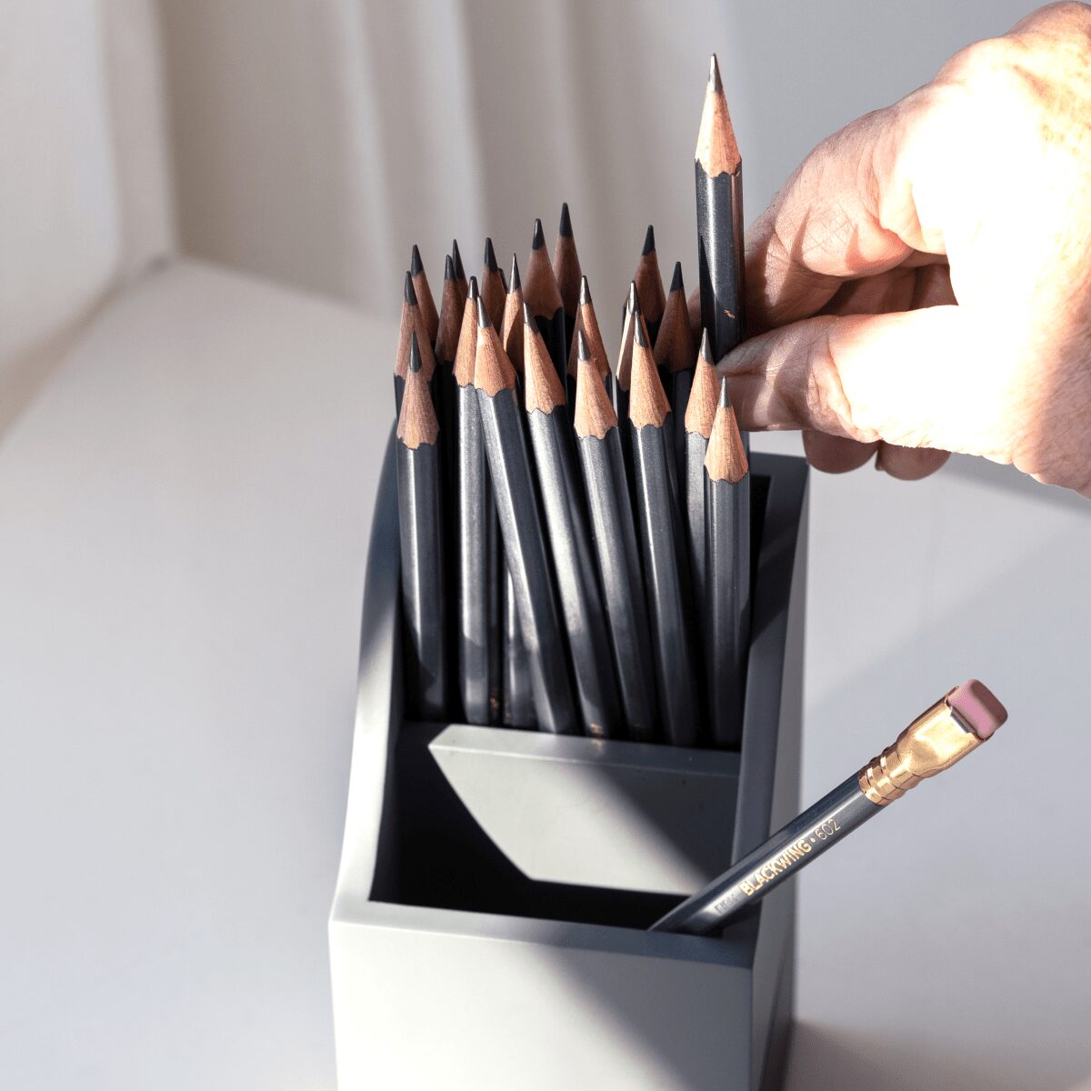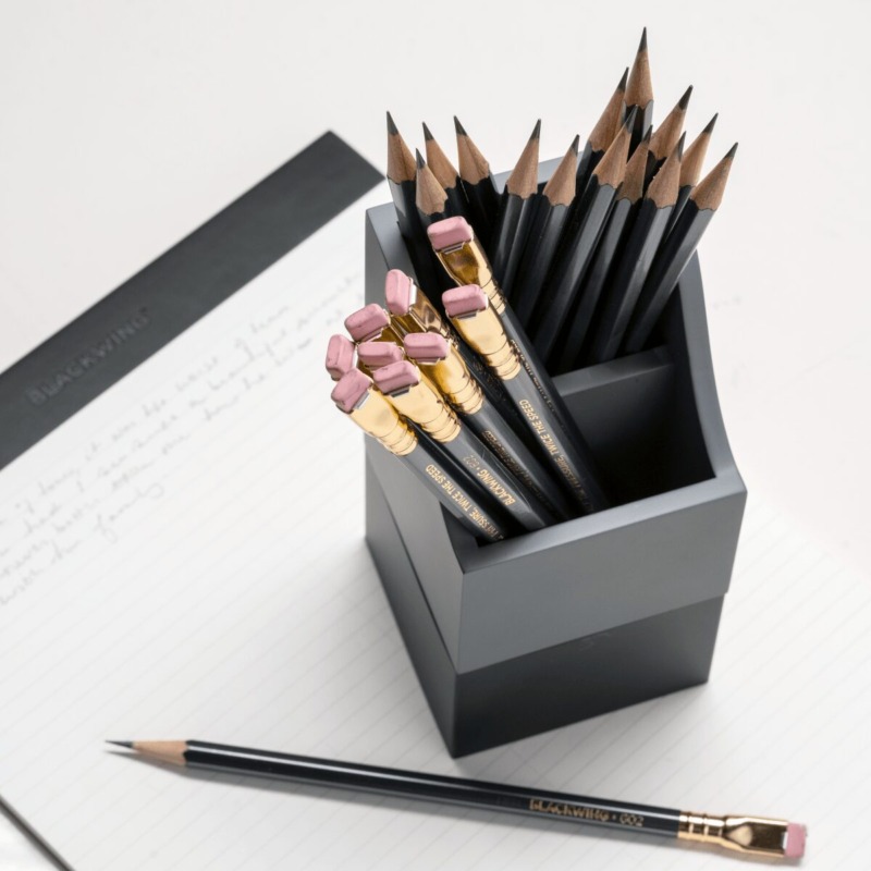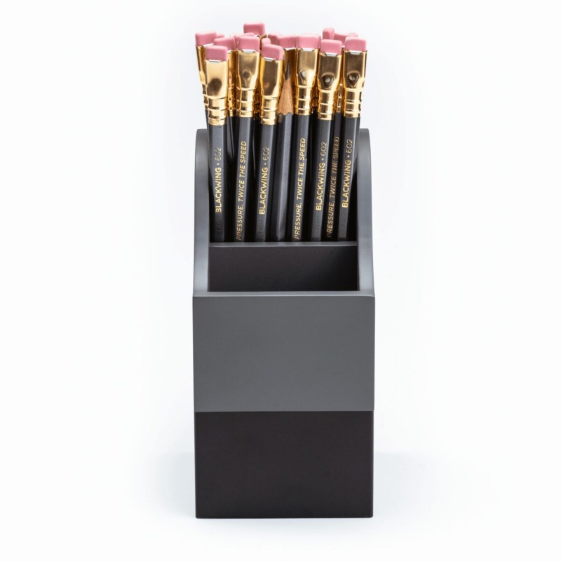 Βάση μολυβιών από την εταιρεία Blackwing. Είναι κατασκευασμένη από Αλουμίνιο και μπορούν να τοποθετηθούν σε αυτή 24 μολυβια σε όρθια θέση. Ο πάτος του κυπέλλου είναι επενδυμένος με φελλό για να διατηρεί τις μύτες των μολυβιών ασφαλείς. Διαθέτει δύο θαλάμους: έναν για μολύβια πλήρους μήκους και τον άλλο για πιο κοντά, ακονισμένα μολύβια. Διαστάσεις: 3 x 3 x 6 inches Όλα τα προιόντα μας αποστέλλονται σε συσκευασία δώρου.
