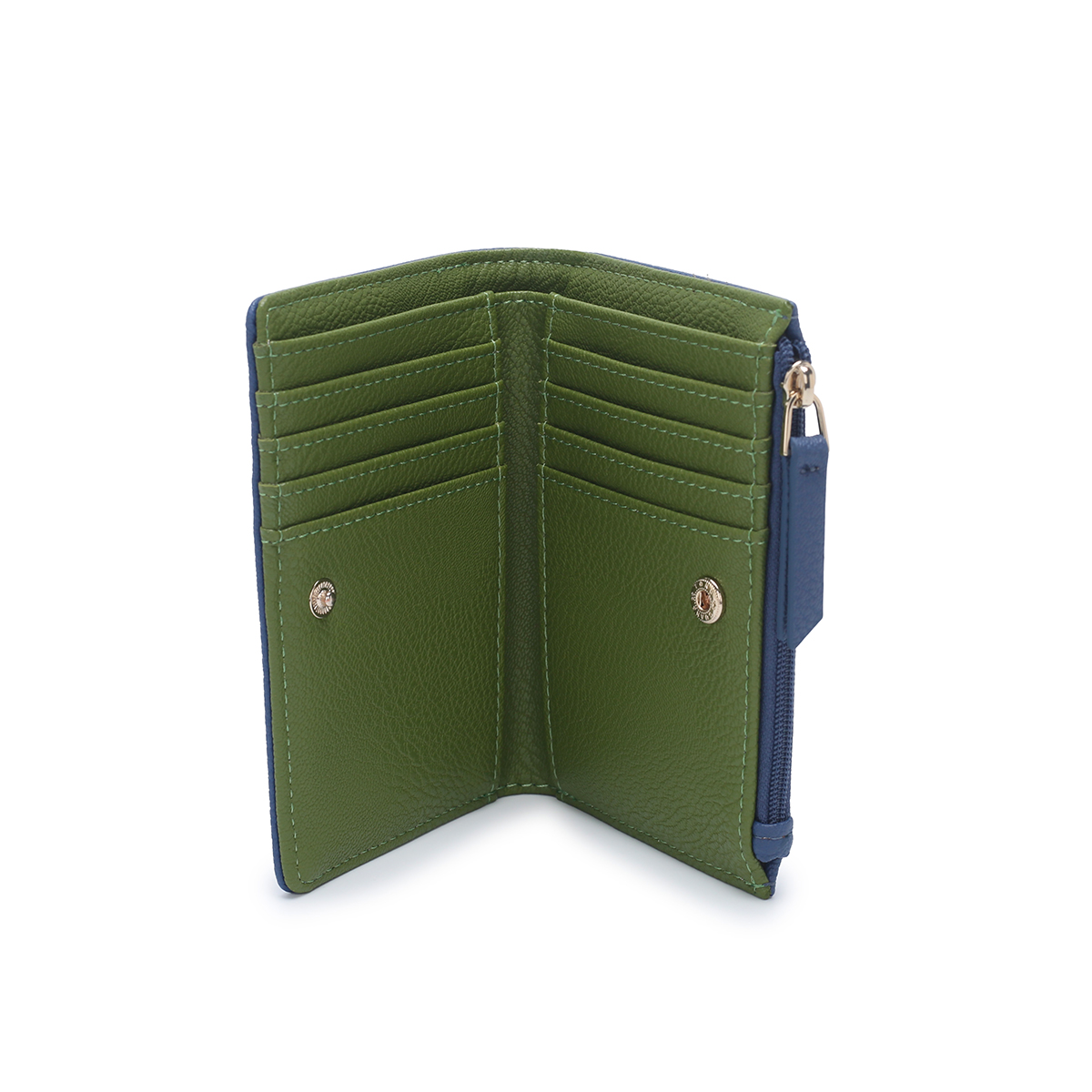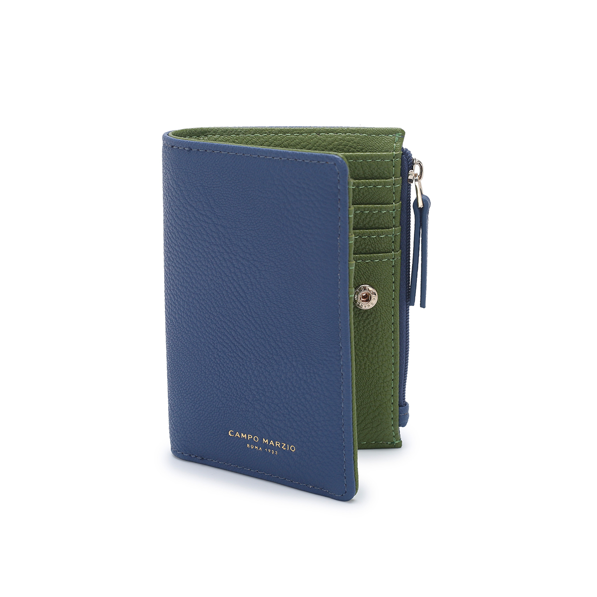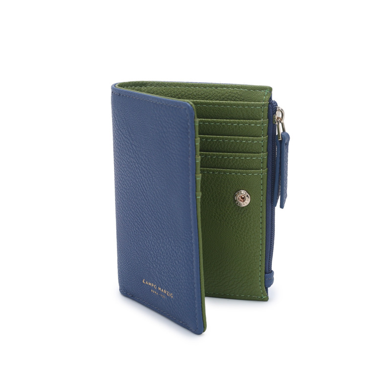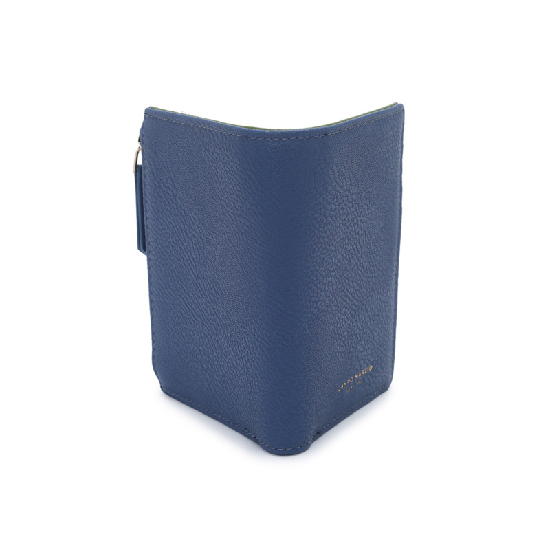 Δερμάτινο πορτοφόλι από την Campo Marzio. Εξωτερικά είναι σε μπλε χρώμα, εσωτερικά σε πράσινο Διαθέτει 1 θήκη για χαρτονομίσματα, 8 θήκες για πιστωτικές κάρτες και 2 πρόσθετες θήκες.