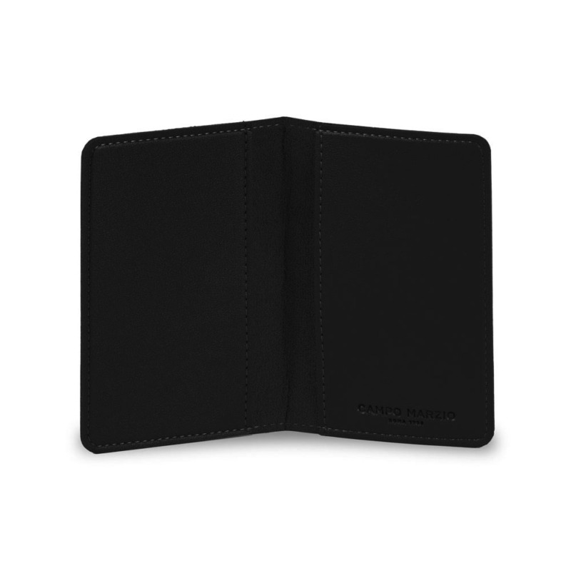 Θήκη Διαβατηρίου από τον οίκο Campo Marzio σε μαύρο χρώμα. Κατασκευασμένη από υψηλής ποιότητας οικολογικό δέρμα, αυτή η κομψή θήκη είναι ιδανική για να προσθέσετε μια πινελιά κομψότητας στα ταξίδια σας, ενώ παράλληλα προστατεύετε τα έγγραφά σας. Διαθέτει στο εσωτερικό δύο πλαϊνές τσέπες για το διαβατήριό σας και την κάρτα επιβίβασης.