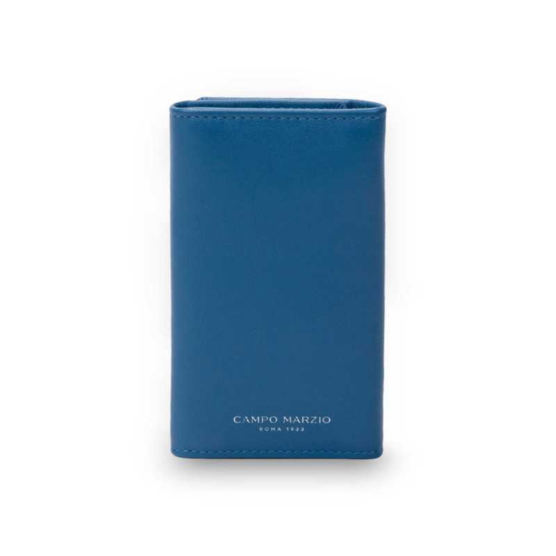 Μπλε κλειδοθήκη της εταιρείας Campo Marzio. Η κλειδοθήκη είναι κατασκευασμένο από δέρμα. Διαθέτει 6 γάντζους και 2 θήκες για πιστωτικές κάρτες