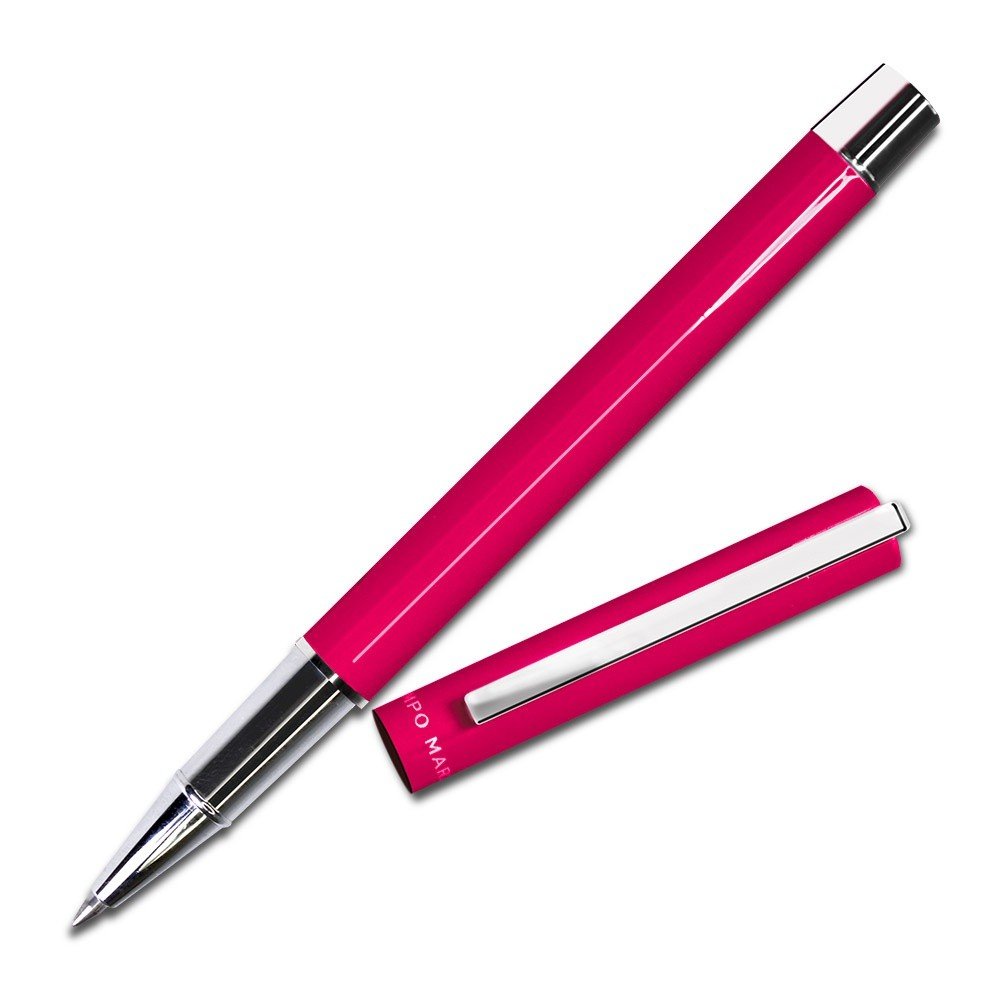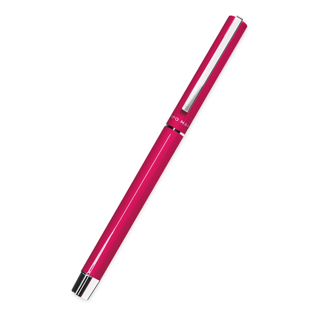 Λεπτό στυλό roller χρώματος φούξια με μεταλλικά στοιχεία. To στυλό ειναι κατασκευασμένο από ρητίνη.