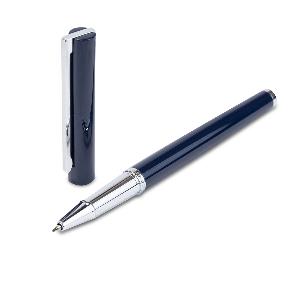 Λεπτό στυλό roller χρώματος μπλε με μεταλλικά στοιχεία. To στυλό ειναι κατασκευασμένο από ρητίνη.