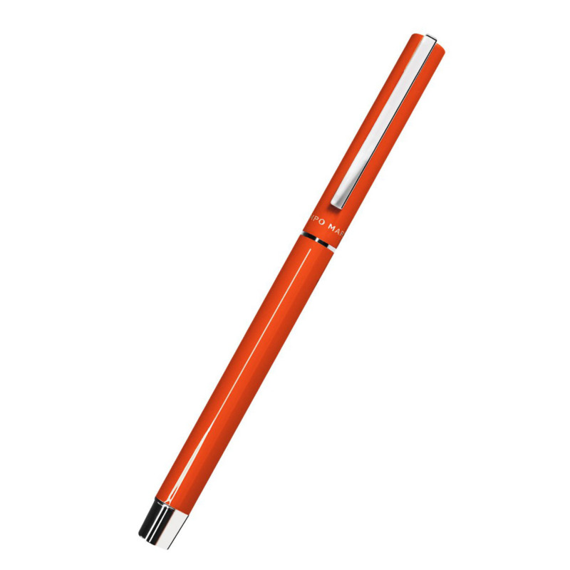 Λεπτό στυλό roller χρώματος πορτοκαλί με μεταλλικά στοιχεία. To στυλό ειναι κατασκευασμένο από ρητίνη.