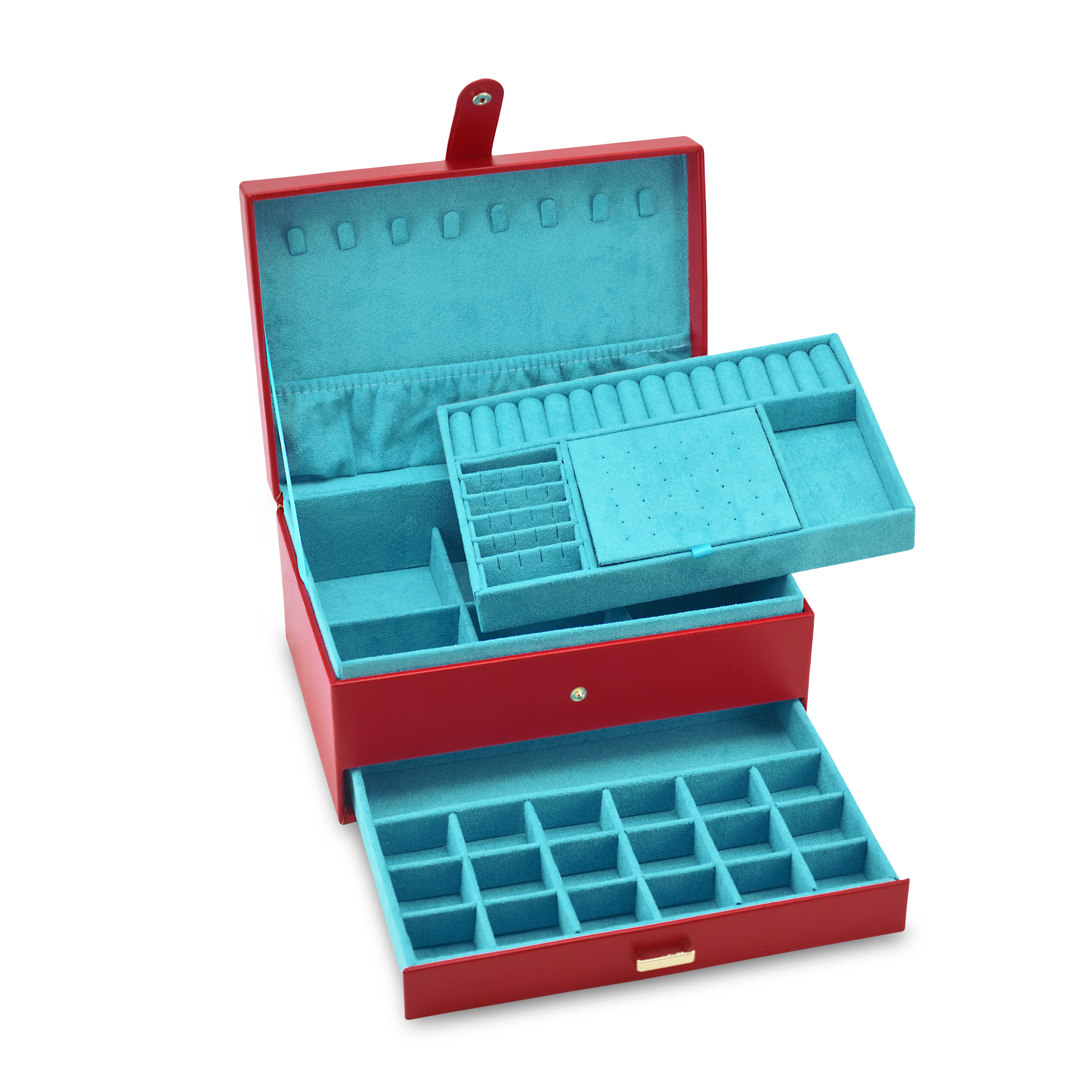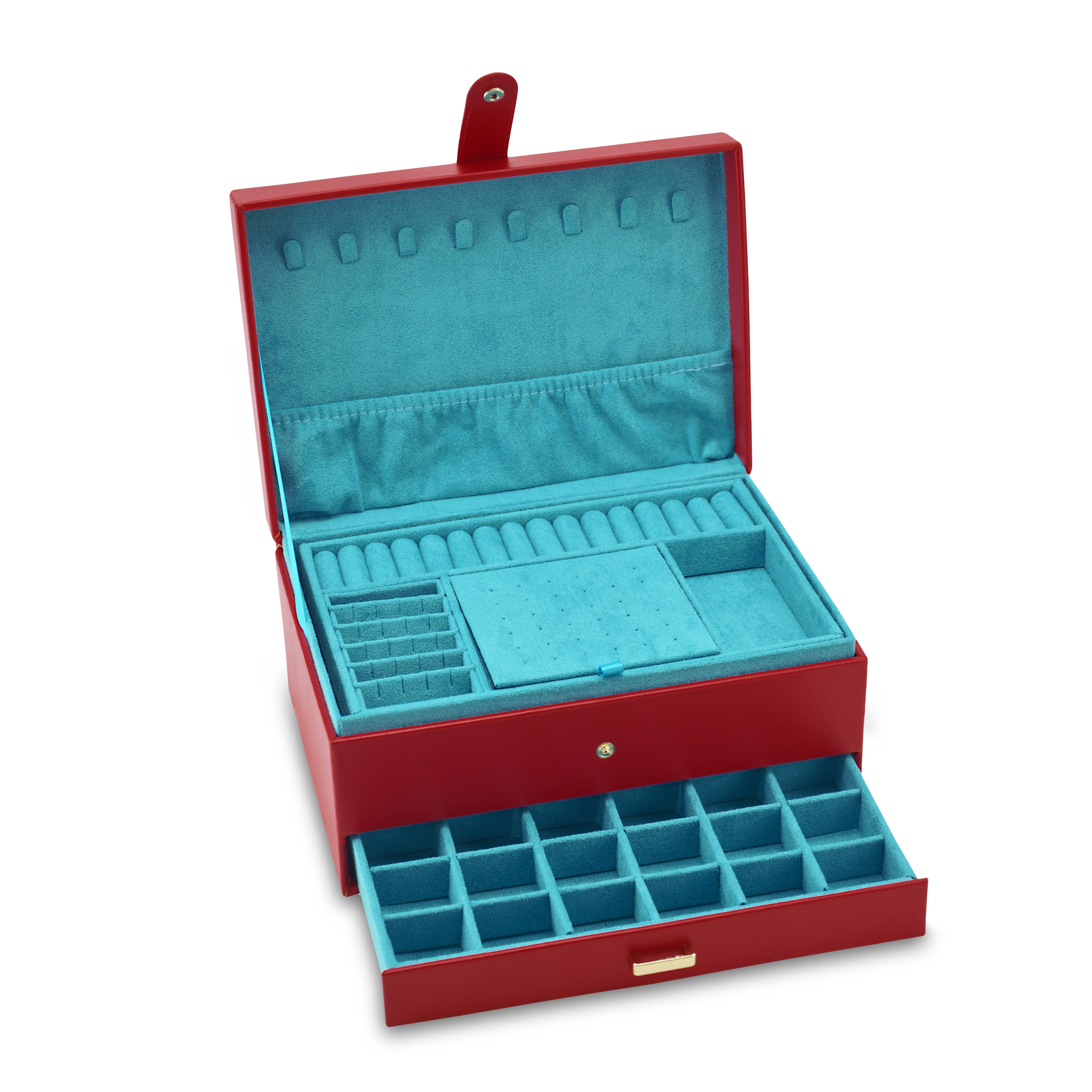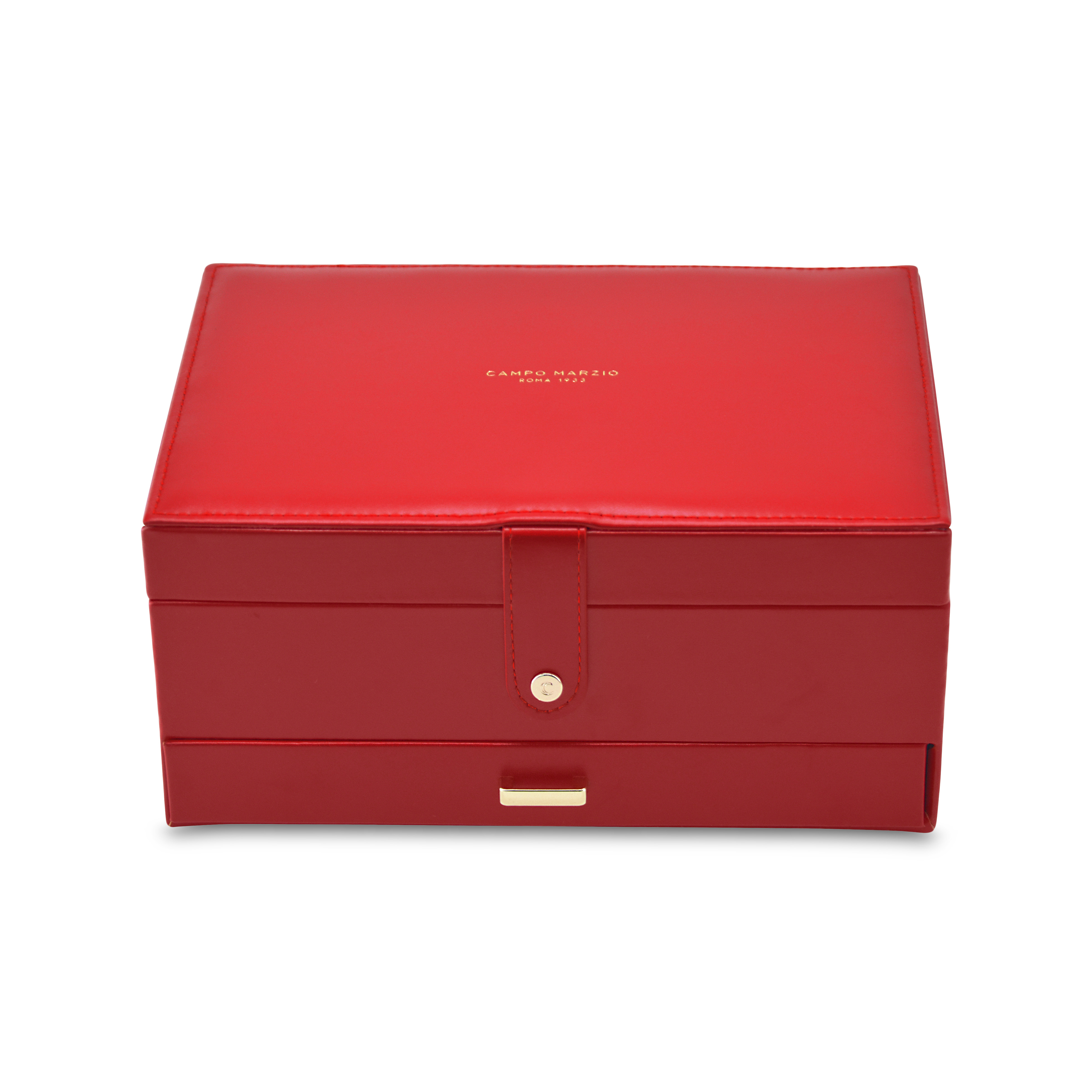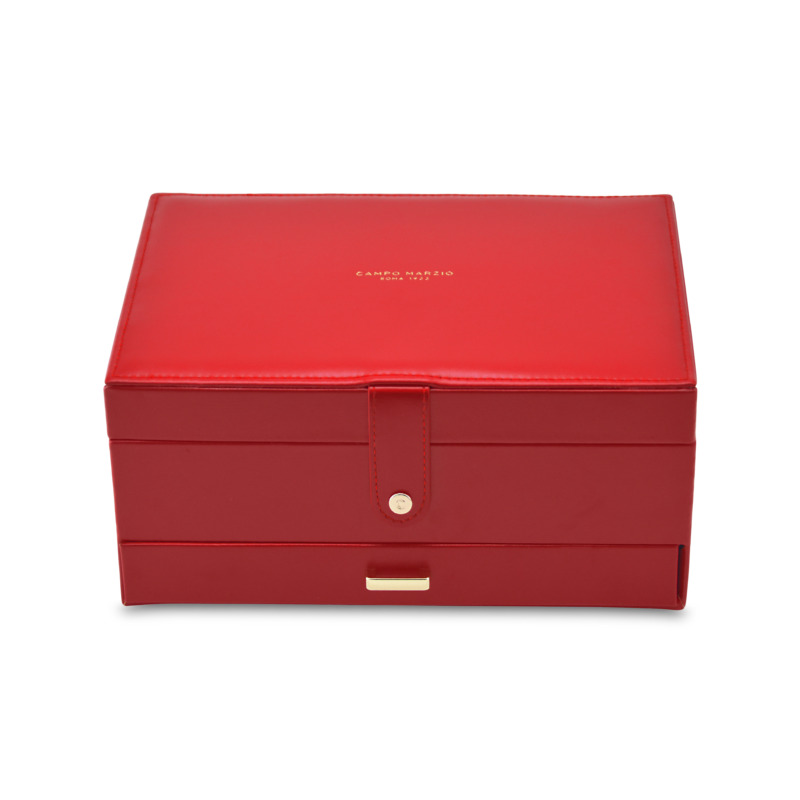 Κοσμηματοθήκη δερμάτινη σε κόκκινο χρώμα. Εσωτερικά έχει θήκες για κολιέ, βραχιόλια και δαχτυλίδια. Ιδανική για μεταφορά κοσμημάτων σε ταξίδια. Όλα μας τα είδη έρχονται σε συσκευασία δώρου. Με την υπηρεσία της προσωποποίησης μπορείτε να προσθέσετε τα μονογράμματά σας.