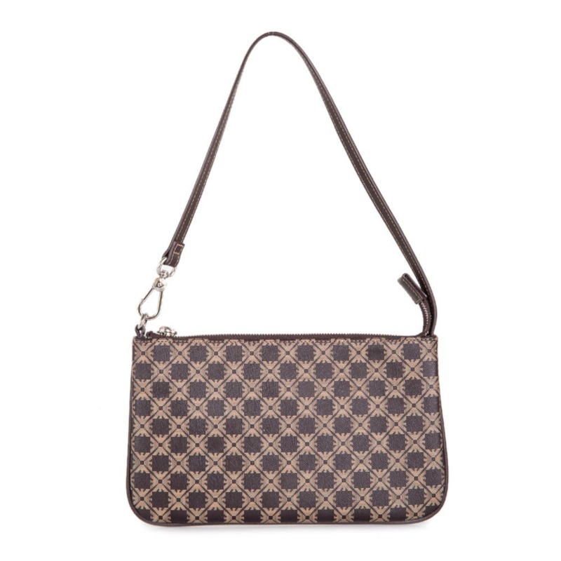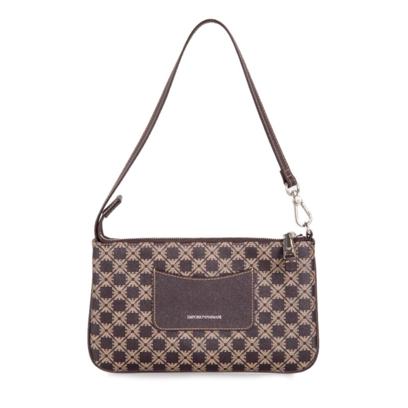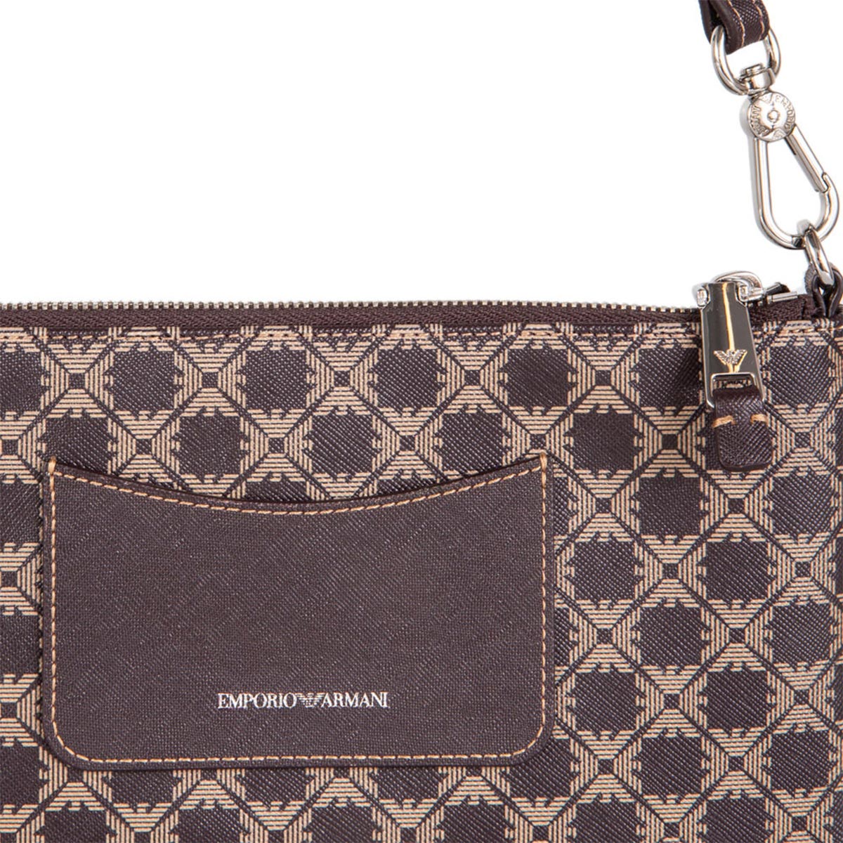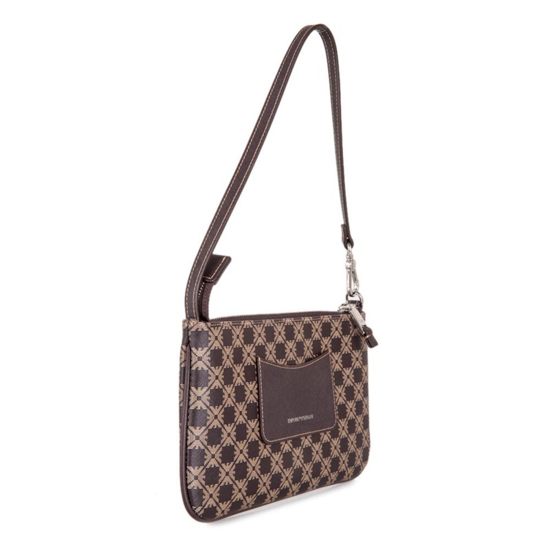 Γυναικεία τσάντα ώμου του οίκου Emporio Armani σε καφέ χρώμα με μπεζ μοτίβο. Κλείνει με φερμουάρ και διαθέτει μία κύρια ενιαία θέση.