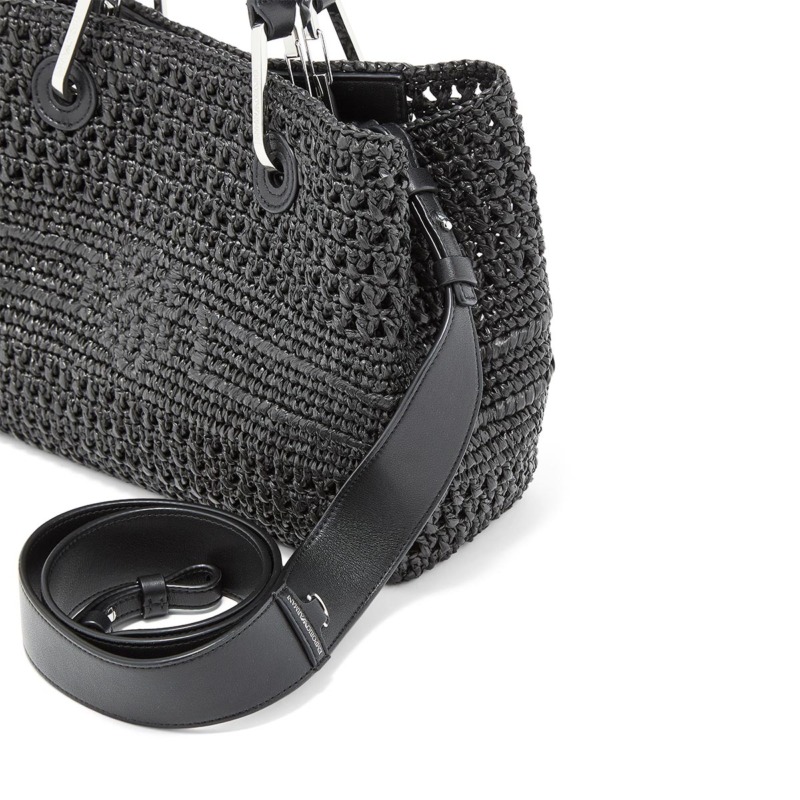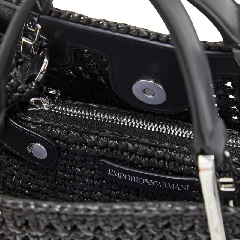 Γυναικεία τσάντα χειρός που μπορεί να φορεθεί και ως crossbody του οίκου Emporio Armani. Κατασκευασμένη από πλεκτή ψάθα και διαθέτει δύο λαβές για άνετο κράτημα στο χέρι ή στον καρπό, καθώς και αποσπώμενο και ρυθμιζόμενο λουράκι ώμου, επιτρέποντας τη μεταφορά της και ως τσάντα ώμου. Έχει έναν ενιαίο χώρο με μαγνητικό κούμπωμα και περιλαμβάνει εσωτερικό τσαντάκι με φερμουάρ για την ασφαλή φύλαξη αντικειμένων. Διαστάσεις: 26 x 19 x 8 cm