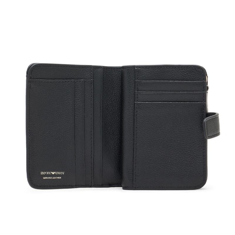 Πορτοφόλι του οίκου Εmporio Armani από δέρμα σε μαύρο χρώμα. Διαθέτει 5 θήκες επαγγελματικών/πιστωτικών καρτών, 3 εναλλακτικές θήκες, 1 θήκη για χαρτονομίσματα και 1 θήκη για κέρματα η οποία κλείνει με φερμουάρ. Διαστάσεις 12 x 9 x 3 cm Ιδανικό δώρο για γυναίκες Όλα τα προϊόντα μας αποστέλλονται σε συσκευασία δώρου. Με την υπηρεσία της προσωποποίησης μπορείτε να χαράξετε το μονόγραμμά σας.
