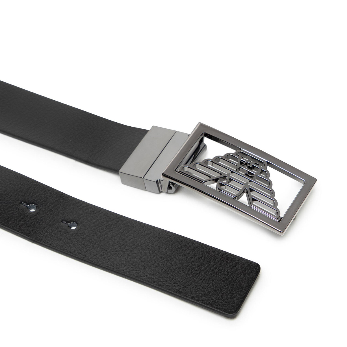 Δερμάτινη ζώνη από τον οίκο Armani. Η ζώνη είναι σε μαύρο χρώμα από την μία πλευρά και σε γκρι χρώμα από την άλλη, μπορεί να φορεθεί και από τις δυο όψεις.