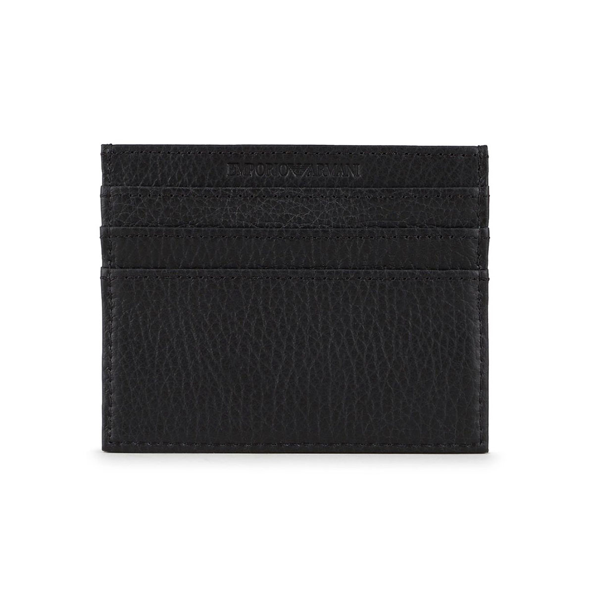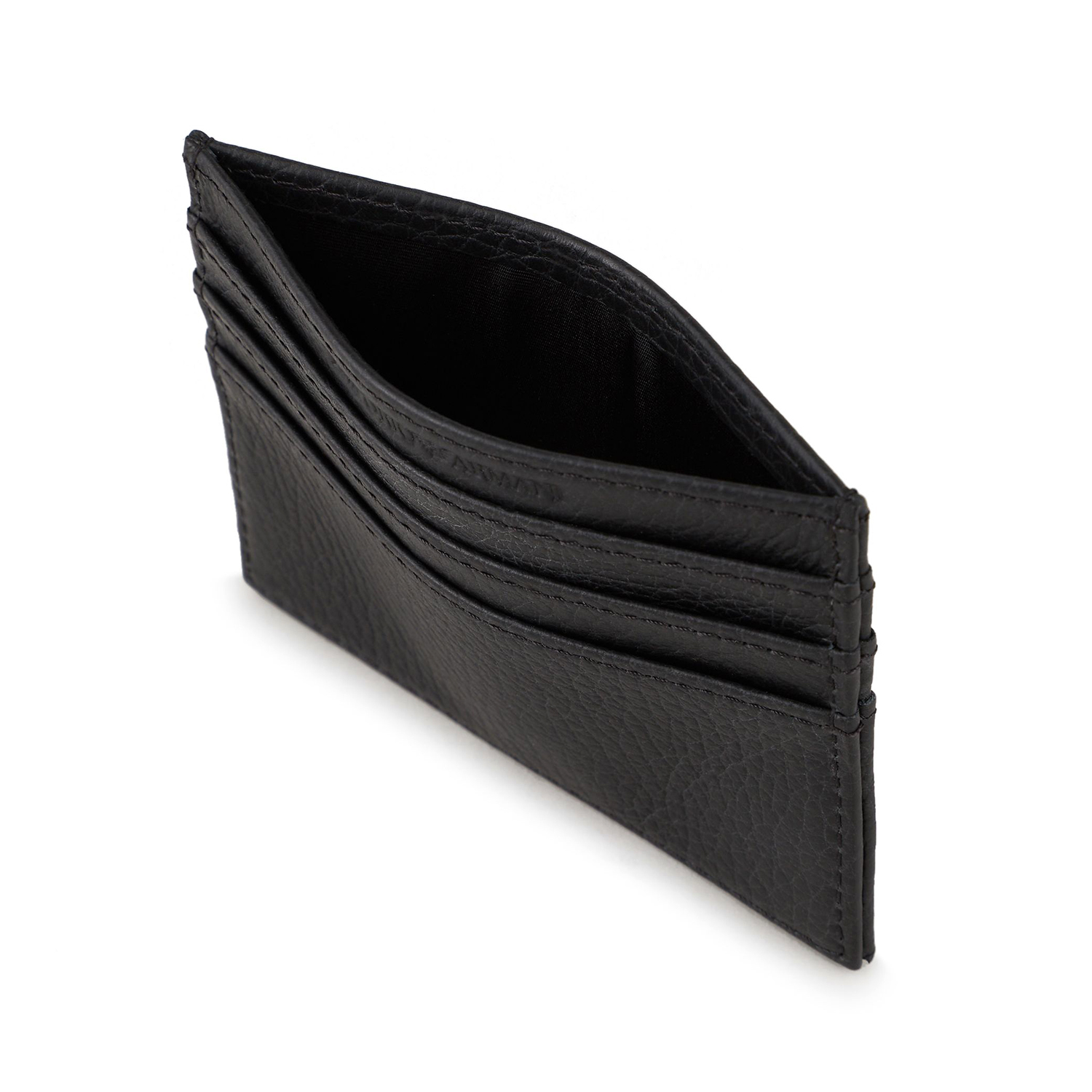 Δερμάτινη καρτοθήκη πιστωτικών καρτών από τον οίκο Armani σε χρώμα μαύρο. Έχει 6 θήκες για πιστωτικές κάρτες και μια θέση για χαρτονομίσματα.