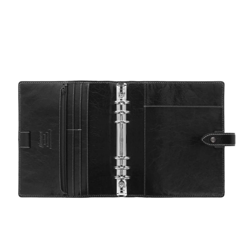 Filofax A5 organiser σε μαύρο χρώμα κατασκευασμένο από δέρμα. Στην αριστερή πλευρά διαθέτει 4 θήκες για κάρτες, 2 κάθετες θήκες , δερμάτινη θηλιά για στυλό, κάθετη τσέπη με φερμουάρ και στην δεξιά διαθέτει δερμάτινη θήκη για στυλό και θήκη για σημειωματάριο. Διαθέτει: Διαφανές ψευδόφυλλο, μπροστινό φύλλο πολυτελείας, ημερολόγιο εβδομάδα σε δύο σελίδες, 6 διαχωριστικά , 4 φύλλα με λίστες υποχρεώσεων , 8 φύλλα σελίδων επαφών , 8 φύλλα σημειωματάριο, 8 φύλλα τετράγωνο χαρτί, 8 φύλλα απλό χαρτί σημειωματάριου, 24 φύλλα διάφορο έγχρωμο χαρτί με γράμματα, καφέ χάρακα/δείκτης σελίδας, επάνω ανοιγόμενος φάκελος Διάσταση: 235 x 224 x 48 mm