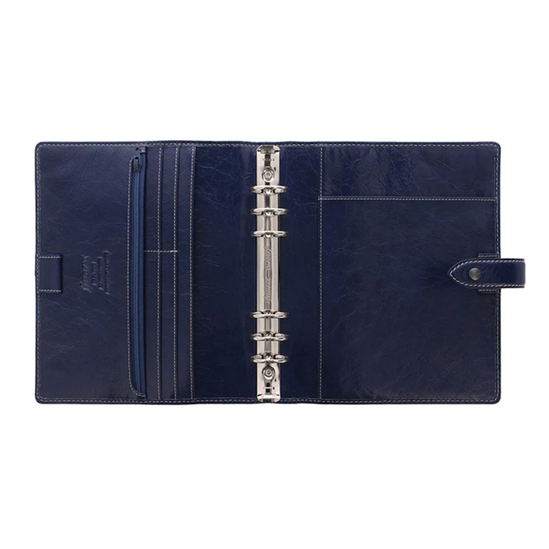 Filofax A5 organiser σε μπλε χρώμα κατασκευασμένο από δέρμα. Στην αριστερή πλευρά διαθέτει 4 θήκες για κάρτες, 2 κάθετες θήκες , δερμάτινη θηλιά για στυλό, κάθετη τσέπη με φερμουάρ και στην δεξιά διαθέτει δερμάτινη θήκη για στυλό και θήκη για σημειωματάριο. Διαθέτει: Διαφανές ψευδόφυλλο, μπροστινό φύλλο πολυτελείας, ημερολόγιο εβδομάδα σε δύο σελίδες, 6 διαχωριστικά , 4 φύλλα με λίστες υποχρεώσεων , 8 φύλλα σελίδων επαφών , 8 φύλλα σημειωματάριο, 8 φύλλα τετράγωνο χαρτί, 8 φύλλα απλό χαρτί σημειωματάριου, 24 φύλλα διάφορο έγχρωμο χαρτί με γράμματα, καφέ χάρακα/δείκτης σελίδας, επάνω ανοιγόμενος φάκελος Διάσταση: 235 x 224 x 48 mm