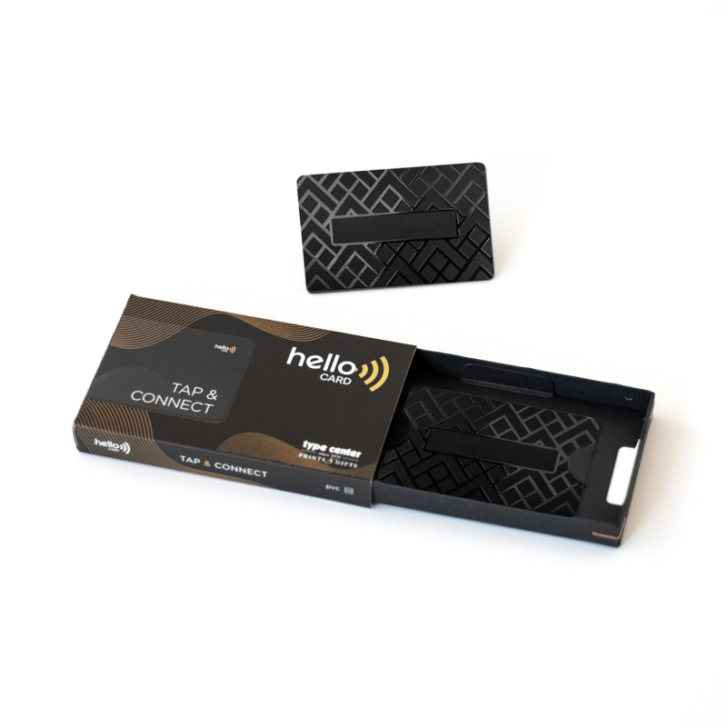 Η νέα επαγγελματική ή προσωπική κάρτα του μέλλοντος. Τώρα η ανταλλαγή πληροφοριών, όπως στοιχεία επικοινωνίας, social, website κ.λπ γίνεται εύκολα, οικολογικά και οικονομικά, χάρη στην Hello Card από την Type Center. Η νέα αυτή κάρτα είναι η μοναδική που χρειάζεται να έχει ο σύγχρονος επαγγελματίας αφού, με ένα μόνο άγγιγμα στο Smartphone, «μεταφέρονται» άμεσα όλα τα στοιχεία που έχουμε επιλέξει να υπάρχουν στην κάρτα. Η Hello Card είναι συμβατή σε όλα τα μοντέλα με IOS από το 2017 και Android από το 2015. Κάντε τη δική σας και, χάρη στην υπηρεσία προσωποποίησης της Type Center, χαράξτε ή εκτυπώστε πάνω της το όνομα ή το λογότυπο που επιθυμείτε.