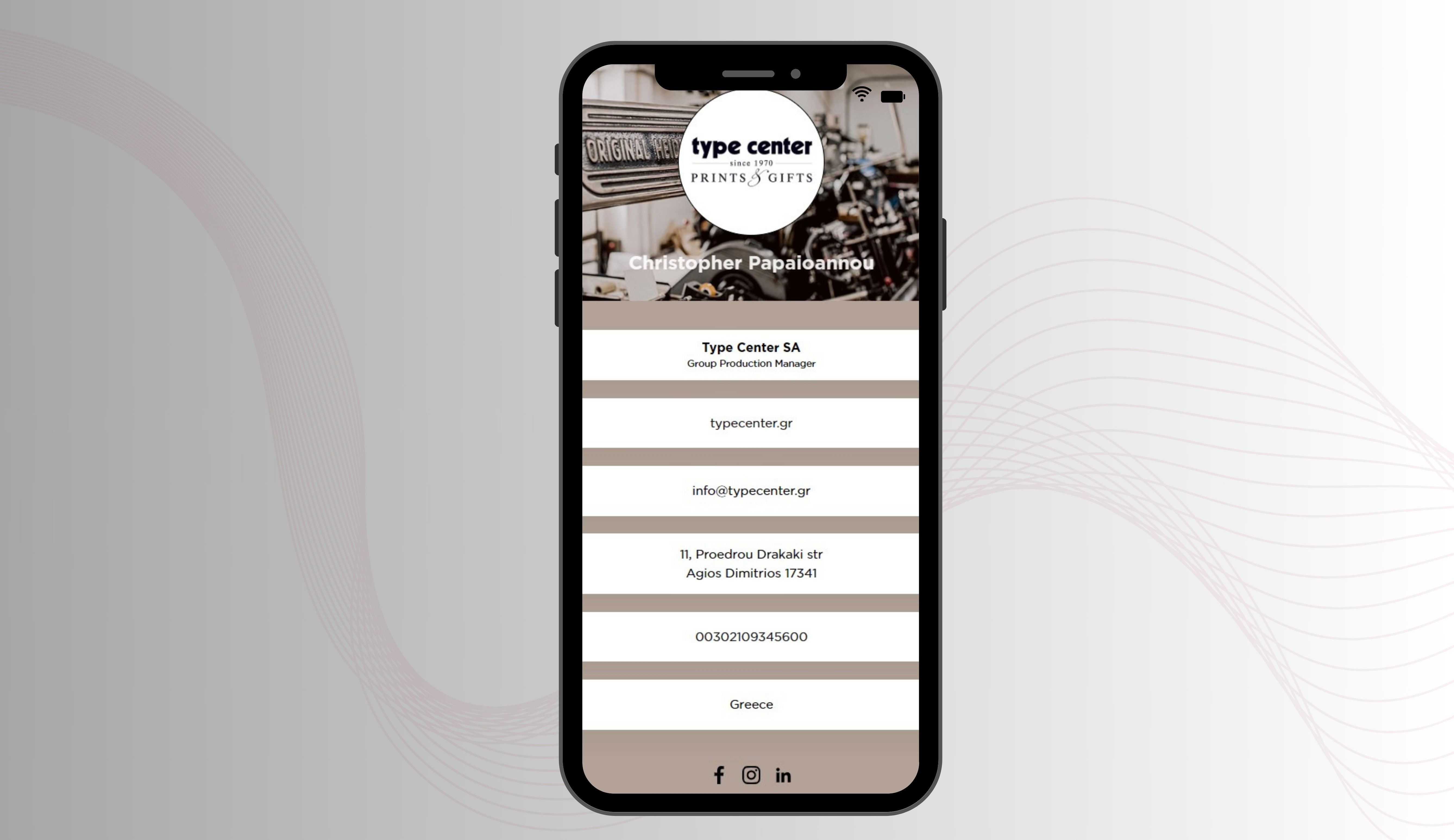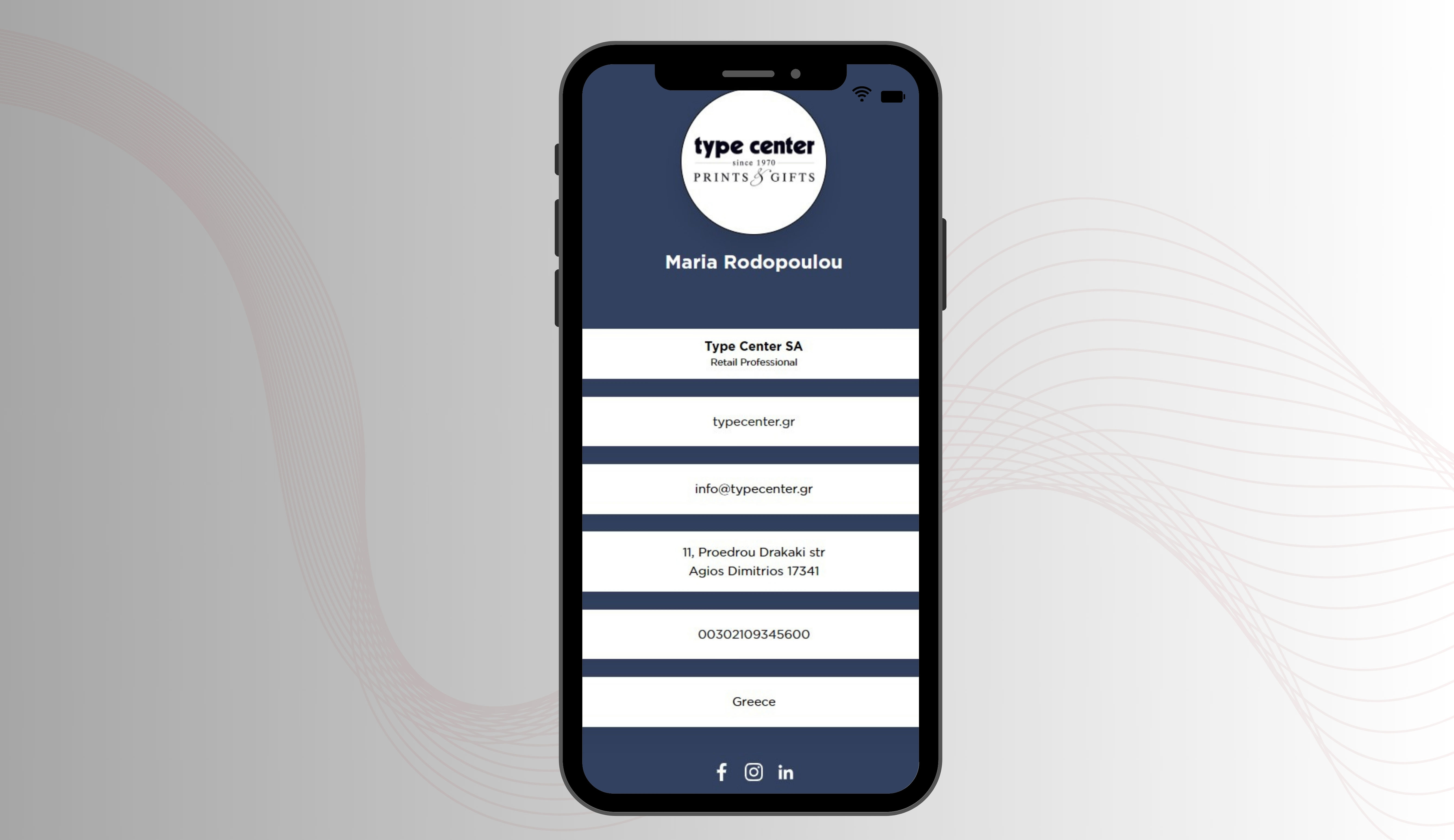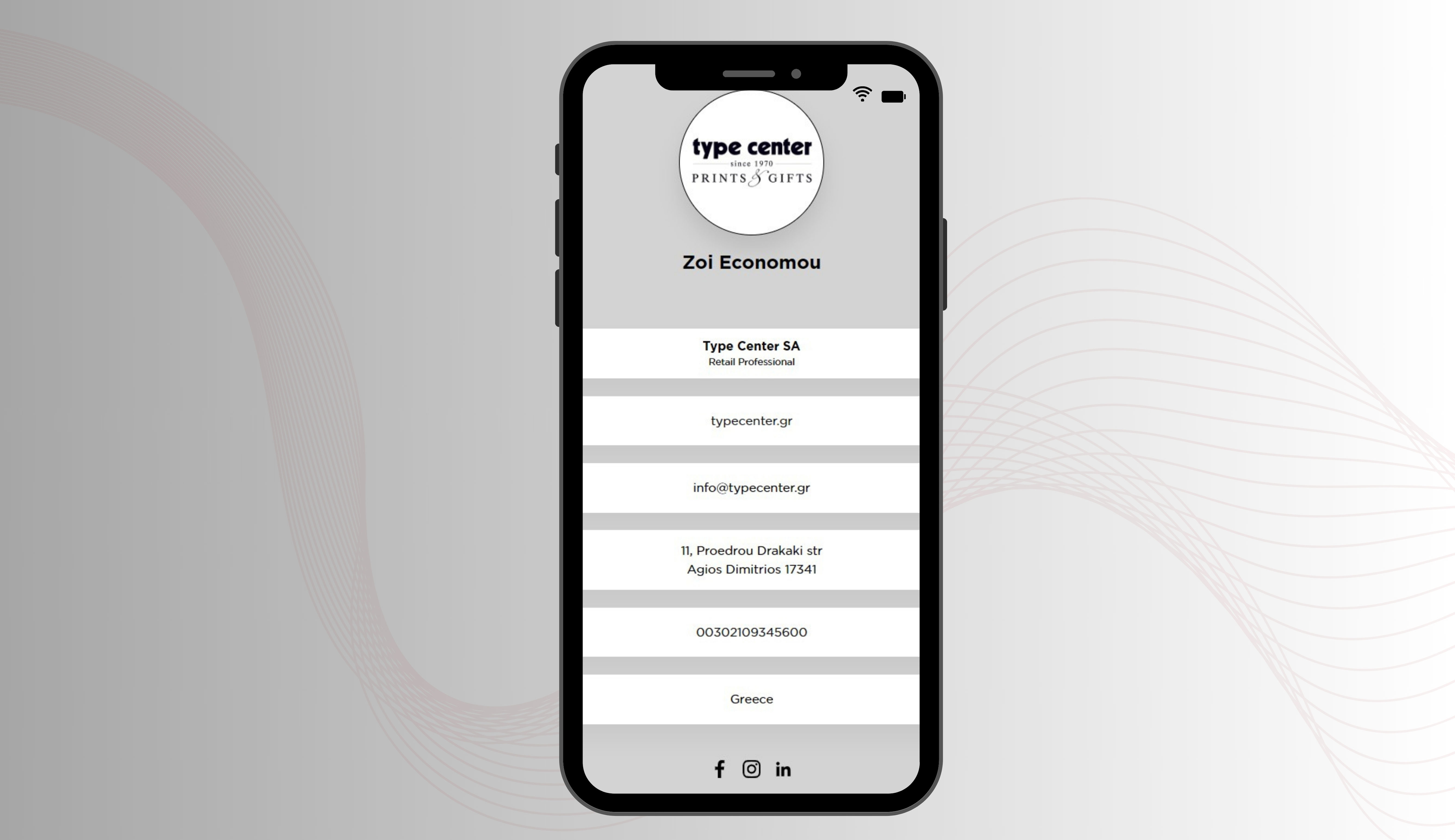 Η νέα επαγγελματική ή προσωπική κάρτα του μέλλοντος. Τώρα η ανταλλαγή πληροφοριών, όπως στοιχεία επικοινωνίας, social, website κ.λπ γίνεται εύκολα, οικολογικά και οικονομικά, χάρη στην Hello Card από την Type Center. Η νέα αυτή κάρτα είναι η μοναδική που χρειάζεται να έχει ο σύγχρονος επαγγελματίας αφού, με ένα μόνο άγγιγμα στο Smartphone, «μεταφέρονται» άμεσα όλα τα στοιχεία που έχουμε επιλέξει να υπάρχουν στην κάρτα. Η Hello Card είναι συμβατή σε όλα τα μοντέλα με IOS από το 2017 και Android από το 2015. Κάντε τη δική σας και, χάρη στην υπηρεσία προσωποποίησης της Type Center, χαράξτε ή εκτυπώστε πάνω της το όνομα ή το λογότυπο που επιθυμείτε.