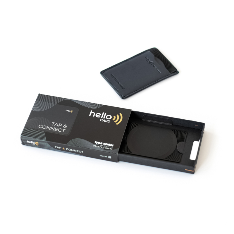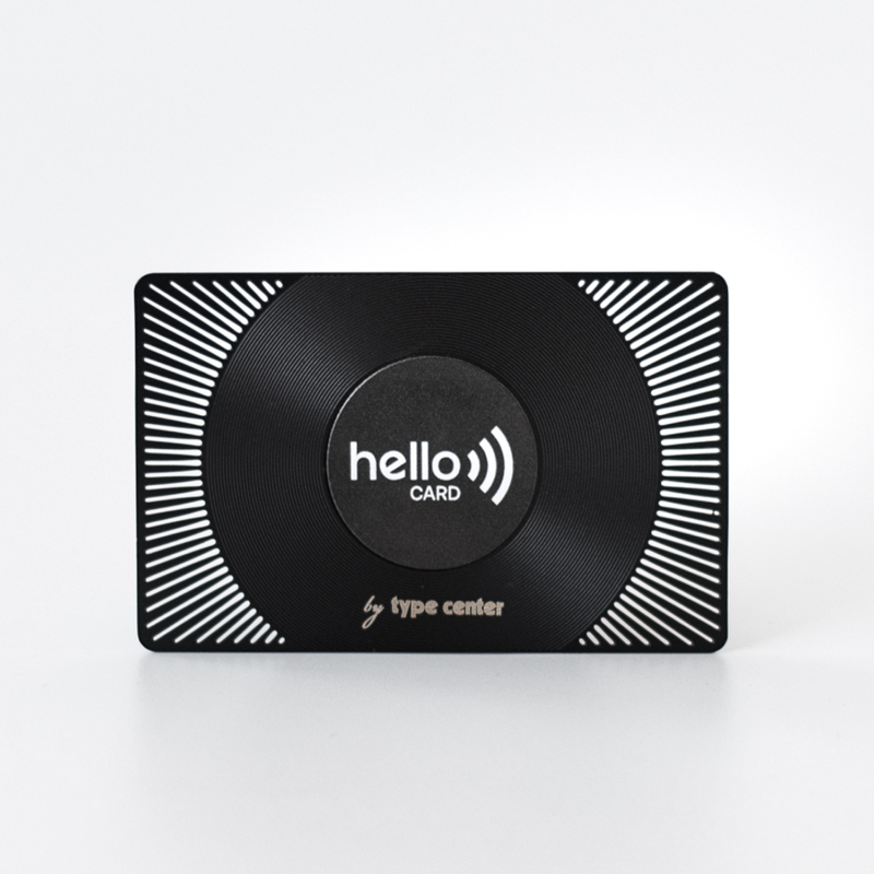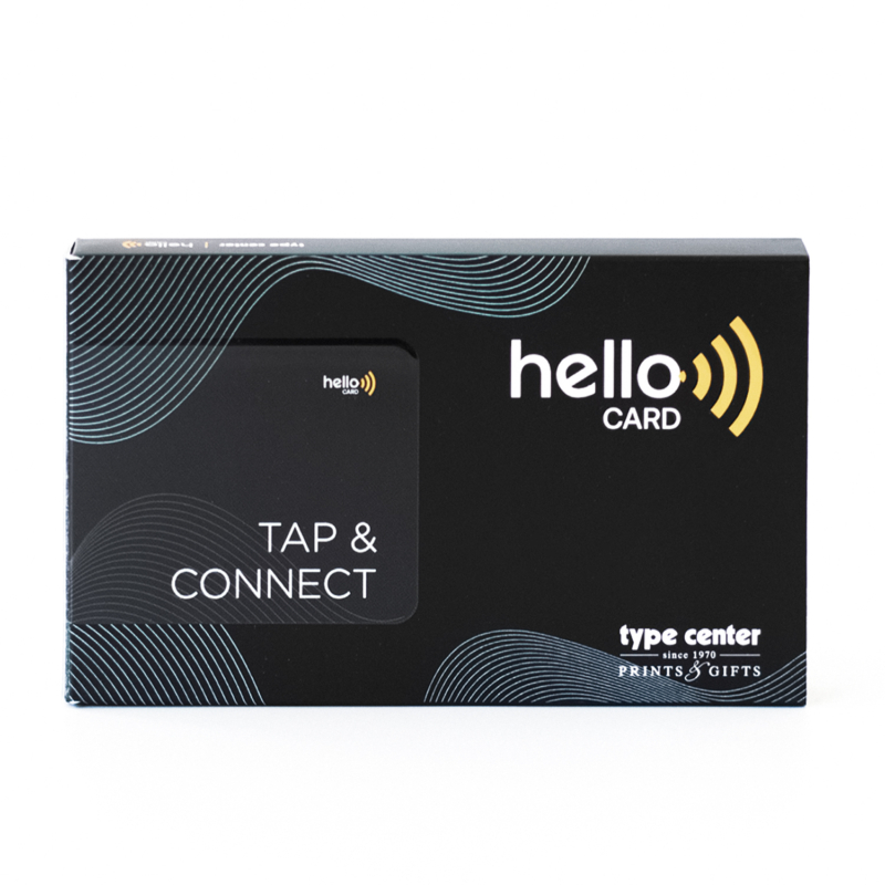 Η νέα επαγγελματική ή προσωπική κάρτα του μέλλοντος. Τώρα η ανταλλαγή πληροφοριών, όπως στοιχεία επικοινωνίας, social, website κ.λπ γίνεται εύκολα, οικολογικά και οικονομικά, χάρη στην Hello Card από την Type Center. Η νέα αυτή κάρτα είναι η μοναδική που χρειάζεται να έχει ο σύγχρονος επαγγελματίας αφού, με ένα μόνο άγγιγμα στο Smartphone, «μεταφέρονται» άμεσα όλα τα στοιχεία που έχουμε επιλέξει να υπάρχουν στην κάρτα. Η Hello Card είναι συμβατή σε όλα τα μοντέλα με IOS από το 2017 και Android από το 2015. Κάντε τη δική σας και, χάρη στην υπηρεσία προσωποποίησης της Type Center, χαράξτε ή εκτυπώστε πάνω της το όνομα ή το λογότυπο που επιθυμείτε.