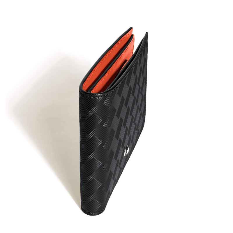 Δερμάτινο πορτοφόλι του οίκου Montblanc κατασκευασμένο από υψίστης ποιότητας δέρμα σε μαύρο-πορτοκαλί χρώμα. Το πορτοφόλι διαθέτει 6 θήκες πιστωτικών καρτών, 2 θήκες για χαρτονομίσματα και 2 εναλλακτικές θήκες. Εσωτερικά, διαθέτει φόδρα ζακάρ και εξωτερικά το έμβλημα της Montblanc από παλλάδιο.