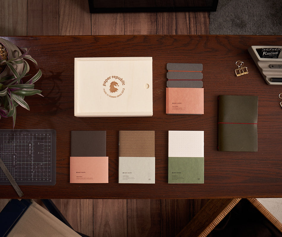 Το Paper Republic Writer’s Essential XL είναι το απόλυτο κιτ εκκίνησης για όλους τους μεγάλους λάτρεις της γραφής. Περιλαμβάνει ένα σημειωματάριο [XL] (15 x 21 cm), σχεδιασμένο να είναι, όπως λέει ο τίτλος, το τέλειο αξεσουάρ για την τσέπη σας, με τέσσερα ανταλλακτικά σημειωματάρια επαναπλήρωσης (plain, ruled, squared and dotted), μία καρτοθήκη [XL] και ένα κιτ με χρωματιστά λάστιχα [XL], τα οποία συσκευάζουμε με προσοχή σε ένα πανέμορφο ξύλινο κουτί κατασκευασμένο στην Αυστρία.