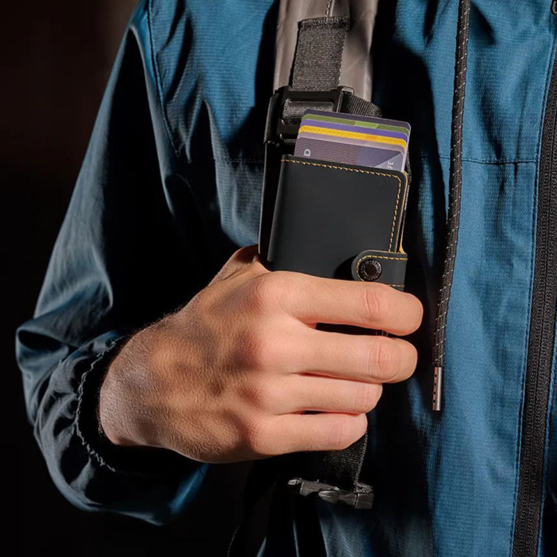 Δερμάτινη Καρτοθήκη πιστωτικών καρτών από την Secrid. Η καρτοθήκη έχει προστασία RFID. Έχει πατενταρισμένο μηχανισμό που βγάζει τις κάρτες με μια πολύ απλή κίνηση για γρήγορη πρόσβαση. Το αλουμίνιο προστατεύει τις κάρτες από ανεπιθύμητες ανέπαφες συναλλαγές.