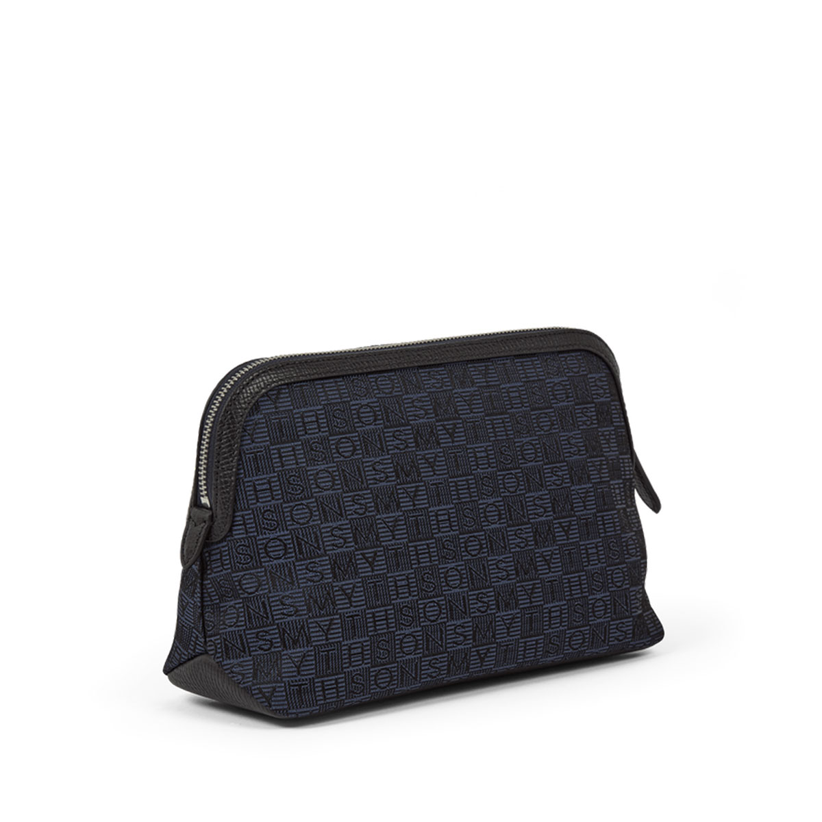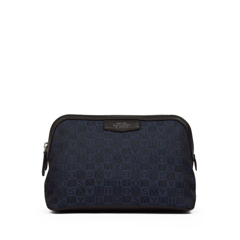 Τσαντάκι προσωπικών ειδών από τον οίκο Smythson σε μπλε σκούρο χρώμα. Είναι κατασκευασμένο από ζακάρ ύφασμα και δερμάτινες λεπτομέρειες. Αυτό το τσαντάκι είναι η ιδανική επιλογή για να έχετε τα προσωπικά σας αντικείμενα τακτοποιημένα σε κάθε σας ταξίδι.