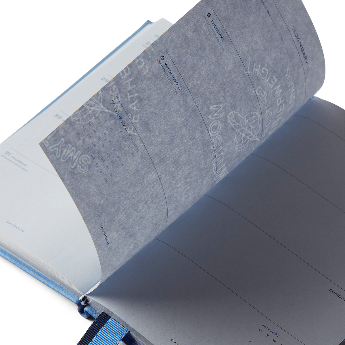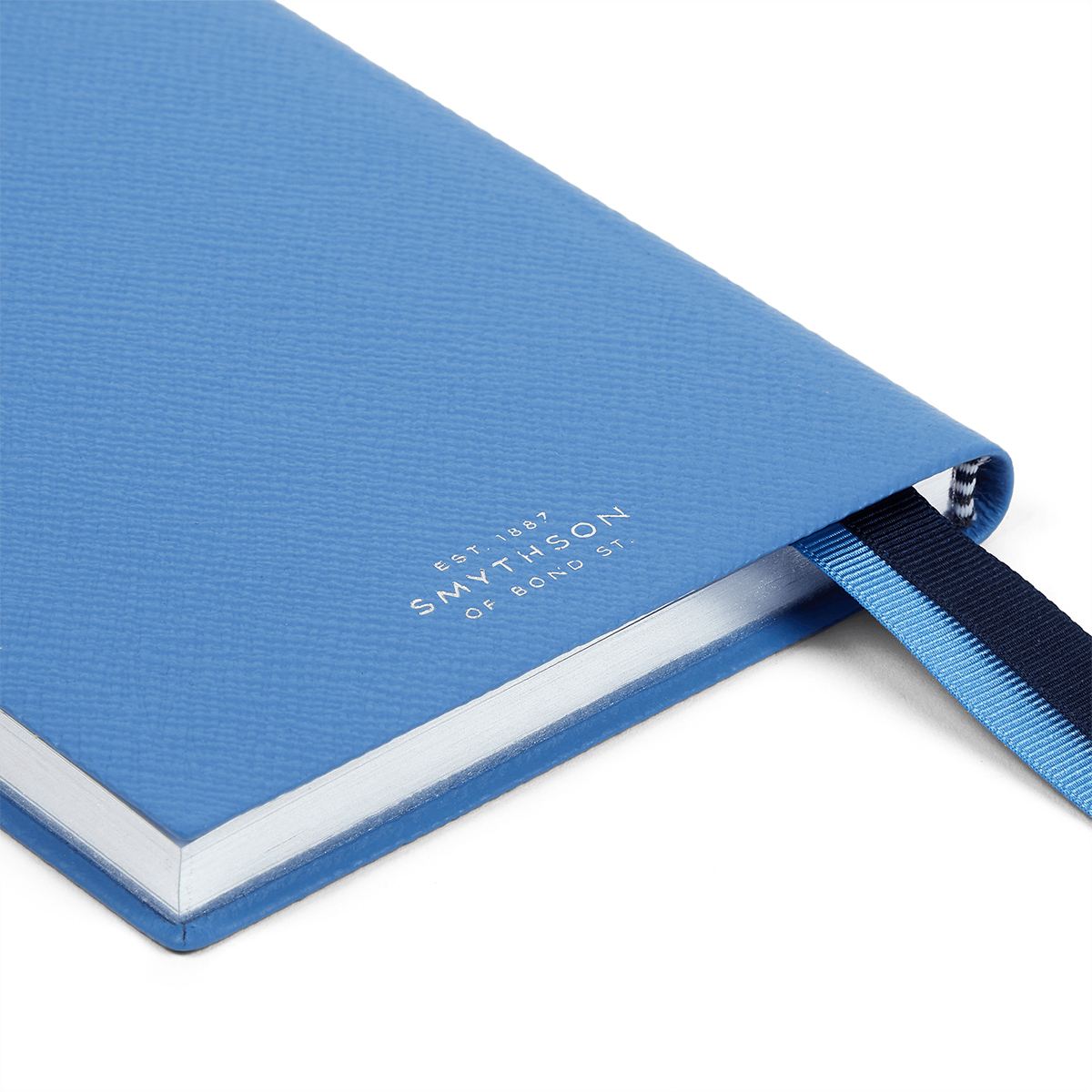Εβδομαδιαίο Ημερολόγιο 2026 Panama με Τσέπη από τον οίκο SMYTHSON σε γαλάζιο χρώμα. Αυτό το κομψό ημερολόγιο είναι κατασκευασμένο από υψηλής ποιότητας δέρμα και διαθέτει διάταξη προβολής εβδομάδας σε 2 σελίδες, επιτρέποντάς σας να οργανώνετε τις εβδομάδες σας με στυλ. Περιλαμβάνει σελιδοδείκτη στο ίδιο χρώμα, χρυσό σόκορο στις σελίδες, και διάτρητες γωνίες για εύκολη χρήση. Στις τελευταίες σελίδες, υπάρχει μια ανθεκτική τσέπη για την αποθήκευση εγγράφων και σημειώσεων. Κατασκευασμένο στην Αγγλία, από χαρτί Featherweight σε απαλό γαλάζιο χρώμα, με έμφαση στην ποιότητα και την αντοχή. Διαστάσεις: 11.2 X 16.7 εκ. Καλύπτει τους μήνες από Δευτέρα 17 Νοεμβρίου 2025 έως Κυριακή 24 Ιανουαρίου 2027.
