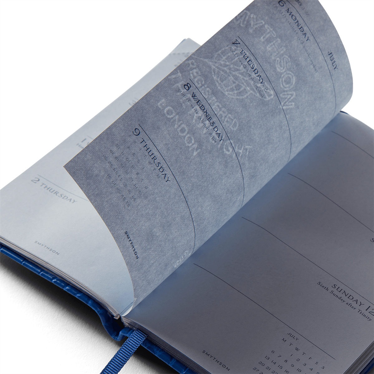 Εβδομαδιαίο Ημερολόγιο 2026 Panama με Τσέπη από τον οίκο SMYTHSON σε μπλε χρώμα. Αυτό το κομψό ημερολόγιο είναι κατασκευασμένο από υψηλής ποιότητας δέρμα και διαθέτει διάταξη προβολής εβδομάδας σε 2 σελίδες, επιτρέποντάς σας να οργανώνετε τις εβδομάδες σας με στυλ. Περιλαμβάνει σελιδοδείκτη στο ίδιο χρώμα, χρυσό σόκορο στις σελίδες, και διάτρητες γωνίες για εύκολη χρήση. Στις τελευταίες σελίδες, υπάρχει μια ανθεκτική τσέπη για την αποθήκευση εγγράφων και σημειώσεων. Κατασκευασμένο στην Αγγλία, από χαρτί Featherweight σε απαλό γαλάζιο χρώμα, με έμφαση στην ποιότητα και την αντοχή. Διαστάσεις: 9 x 14 εκ. Καλύπτει τους μήνες από Δευτέρα 17 Νοεμβρίου 2025 έως Κυριακή 24 Ιανουαρίου 2027.