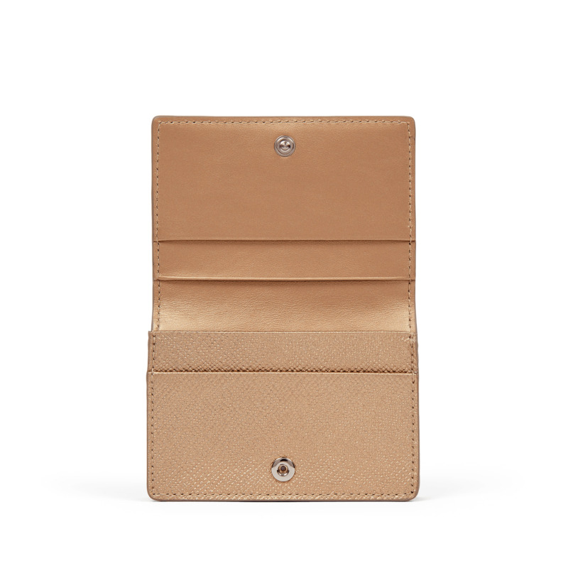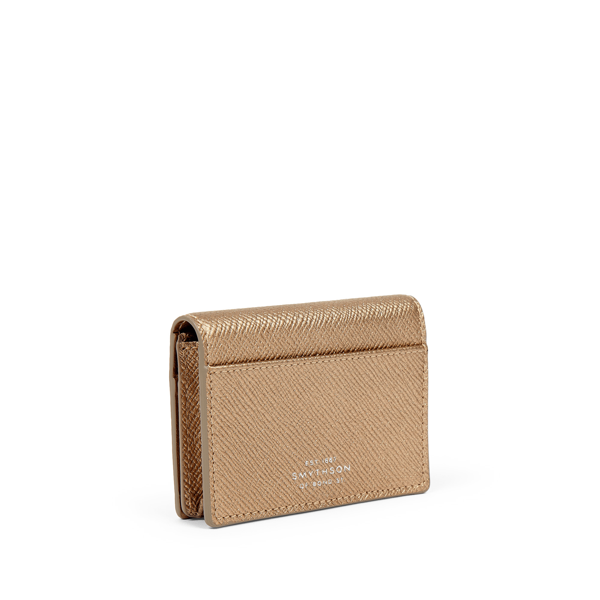 Καρτοθήκη από τον οίκο Smythson σε Bronze χρώμα. Κατασκευασμένη από υψηλής ποιότητας δέρμα, αυτή η θήκη είναι ιδανική για επαγγελματική και καθημερινή χρήση. Διαθέτει 3 θήκες για πιστωτικές κάρτες και μια πρόσθετη θήκη για επιπλέον αποθήκευση στο εσωτερικό και στο εξωτερικό μια επιπλέον θήκη για κάρτες.
