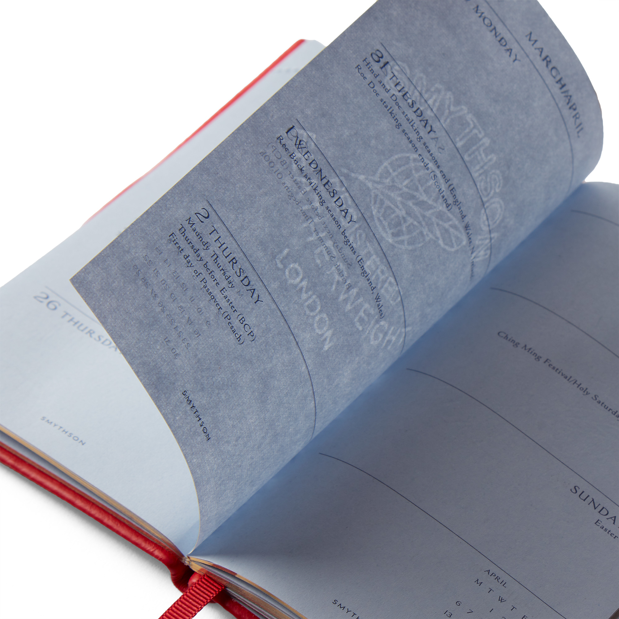 Εβδομαδιαίο ημερολόγιο 2026 Panama με τσέπη από τον οίκο Smythson σε κόκκινο χρώμα. Αυτό το κομψό ημερολόγιο είναι κατασκευασμένο από υψηλής ποιότητας Panama δέρμα και διαθέτει διάταξη προβολής εβδομάδας σε 2 σελίδες, επιτρέποντάς σας να οργανώνετε τις εβδομάδες σας με στυλ. Περιλαμβάνει σελιδοδείκτη στο ίδιο χρώμα, χρυσό σόκορο στις σελίδες, και διάτρητες γωνίες για εύκολη χρήση. Στις τελευταίες σελίδες, υπάρχει μια ανθεκτική τσέπη για την αποθήκευση εγγράφων και σημειώσεων. Κατασκευασμένο στην Αγγλία, από χαρτί Featherweight σε απαλό γαλάζιο χρώμα, με έμφαση στην ποιότητα και την αντοχή. Διαστάσεις: 9 x 14 εκ. Καλύπτει τους μήνες από Δευτέρα 17 Νοεμβρίου 2025 έως Κυριακή 24 Ιανουαρίου 2027.