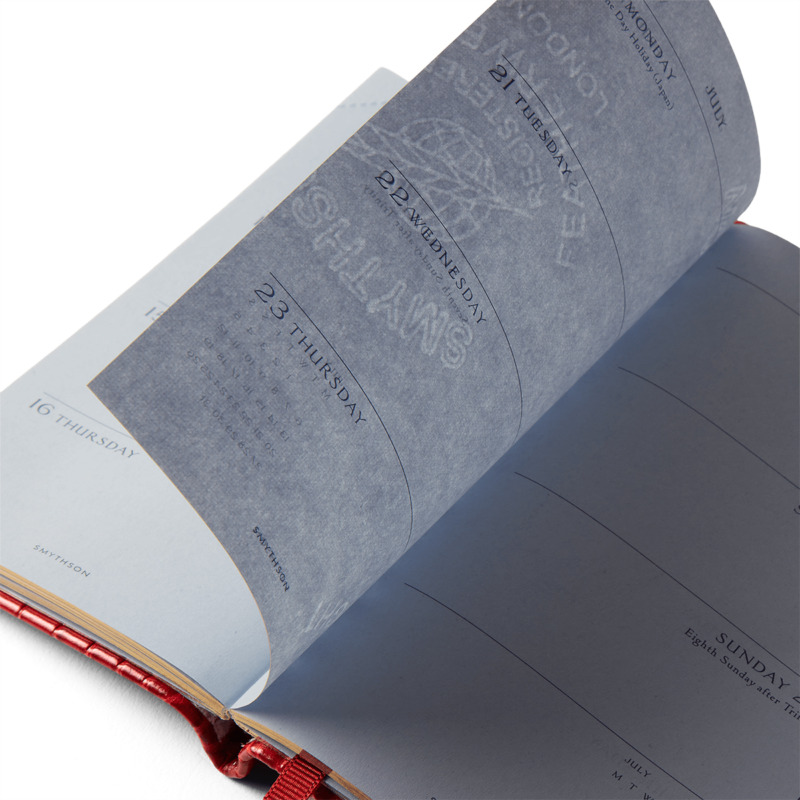 Εβδομαδιαίο ημερολόγιο 2026 Panama με τσέπη από τον οίκο Smythson σε κόκκινο χρώμα. Αυτό το κομψό ημερολόγιο είναι κατασκευασμένο από υψηλής ποιότητας Mara δέρμα και διαθέτει διάταξη προβολής εβδομάδας σε 2 σελίδες, επιτρέποντάς σας να οργανώνετε τις εβδομάδες σας με στυλ. Περιλαμβάνει σελιδοδείκτη στο ίδιο χρώμα, χρυσό σόκορο στις σελίδες, και διάτρητες γωνίες για εύκολη χρήση. Στις τελευταίες σελίδες, υπάρχει μια ανθεκτική τσέπη για την αποθήκευση εγγράφων και σημειώσεων. Κατασκευασμένο στην Αγγλία, από χαρτί Featherweight σε απαλό γαλάζιο χρώμα, με έμφαση στην ποιότητα και την αντοχή. Διαστάσεις: 9 x 14 εκ. Καλύπτει τους μήνες από Δευτέρα 17 Νοεμβρίου 2025 έως Κυριακή 24 Ιανουαρίου 2027.