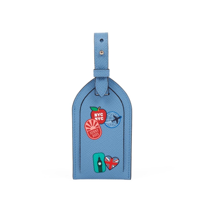 Ετικέτα αποσκευής από τον οίκο Smythson σε γαλάζιο χρώμα με διακοσμητικά μοτίβα αυτοκόλλητων. Αυτή η ετικέτα αποσκευών είναι η ιδανική επιλογή για να προσθέσετε μια πινελιά πολυτέλειας και στυλ στις ταξιδιωτικές σας εμπειρίες.