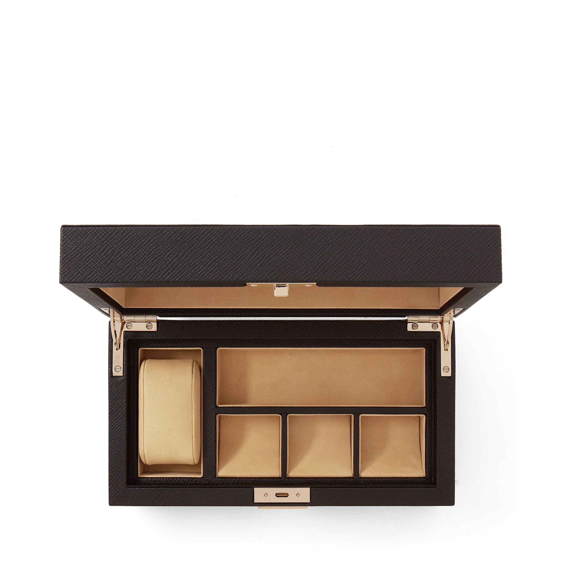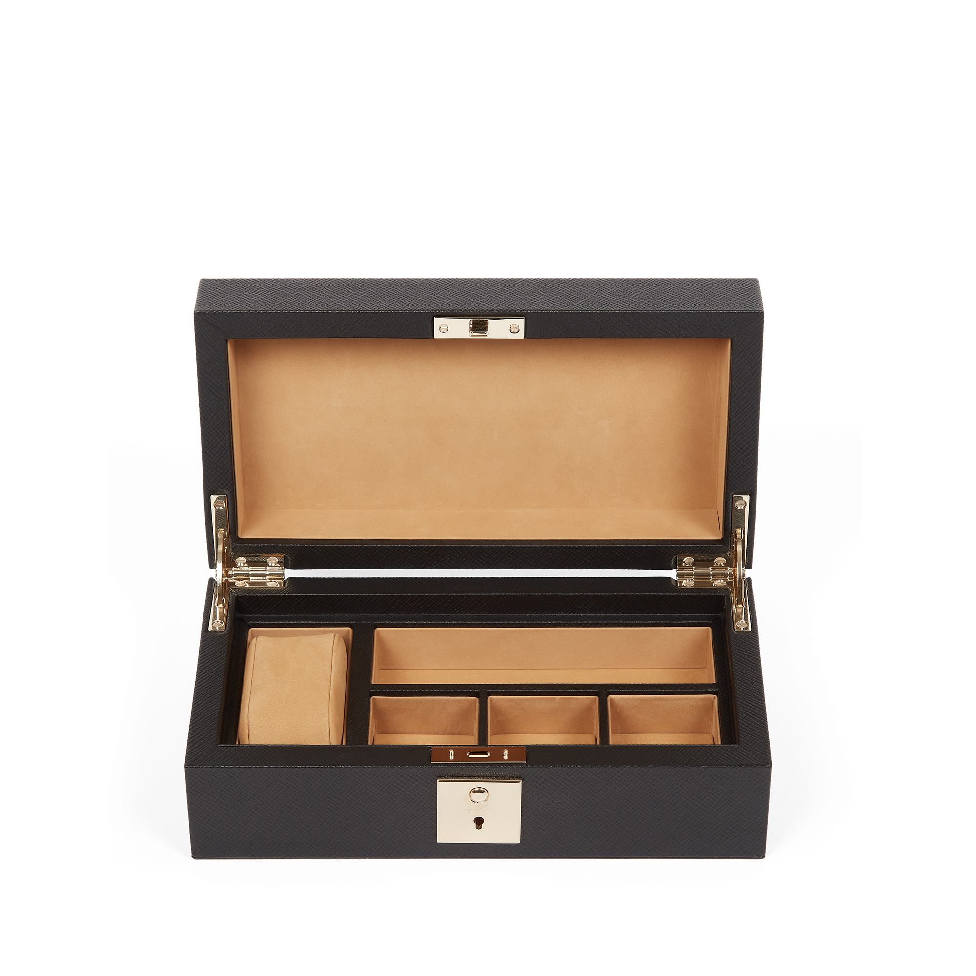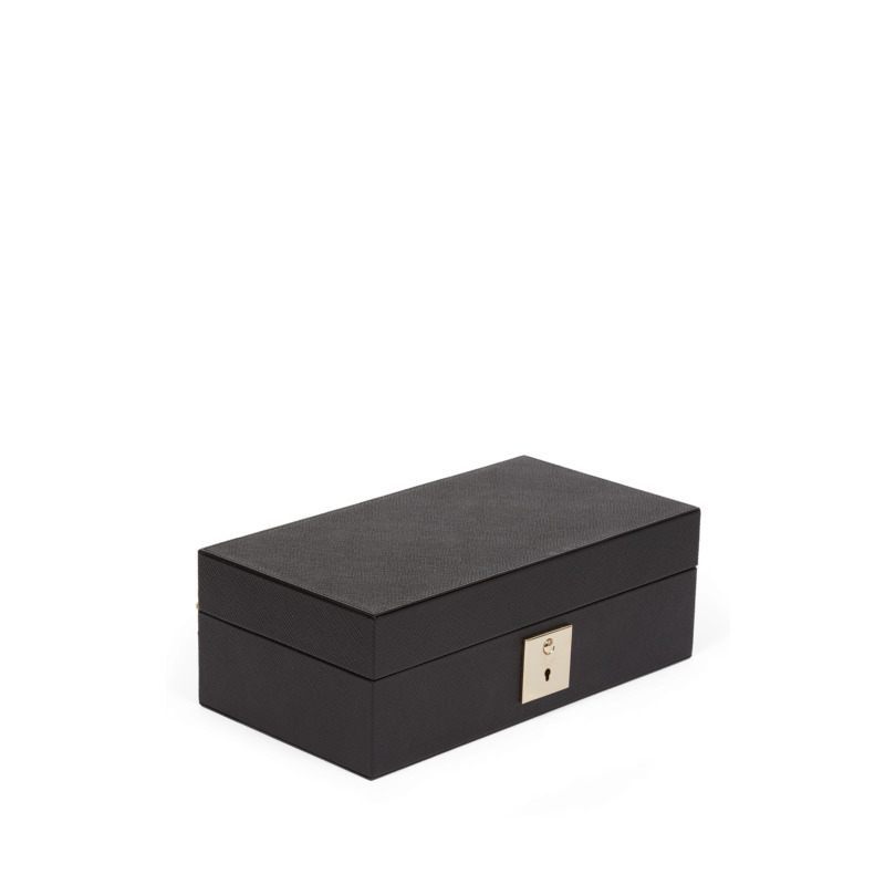 Με μία ειδική θέση για ρολόι, τρεις θήκες για μανικετόκουμπα και ένα ευρύχωρο οριζόντιο διαμέρισμα, προσφέρει την απόλυτη λειτουργικότητα. Η θήκη ασφαλίζει με κλειδί για πρόσθετη ασφάλεια.