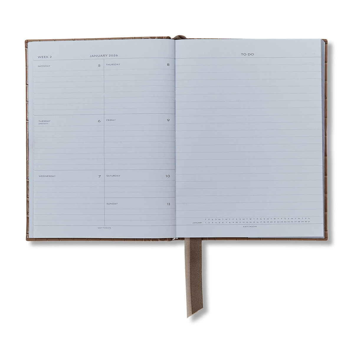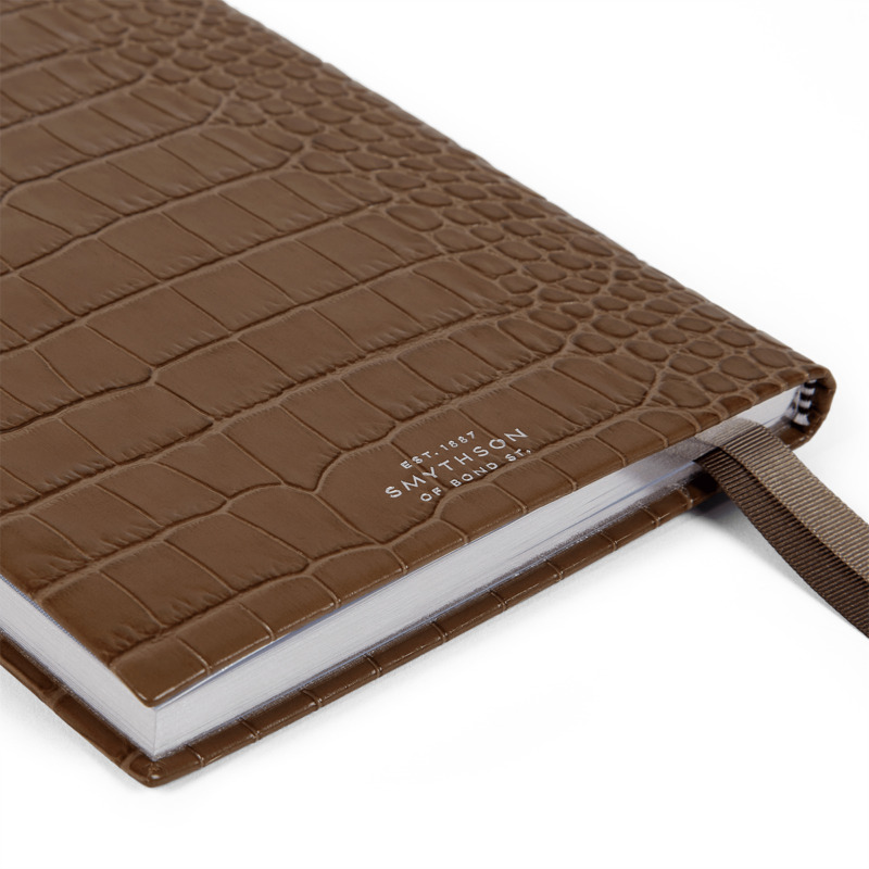 Σημειωματάριο Soho από τον οίκο Smythson, σε καφέ χρώμα. Κατασκευασμένο από υψηλής ποιότητας δέρμα, αυτό το κομψό σημειωματάριο είναι ιδανικό για να καταγράφετε τις καθημερινές σας σκέψεις, να διατηρείτε τις λίστες υποχρεώσεων σας οργανωμένες και να σημειώνετε τις προσωπικές σας σημειώσεις. Το σημειωματάριο διαθέτει σελιδοδείκτη στο ίδιο χρώμα για εύκολη πρόσβαση στις σελίδες σας, καθώς και ασημί σόκορο που προσδίδει μια αίσθηση πολυτέλειας.