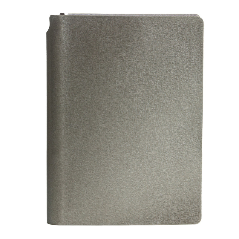 Σημειωματάριο με θέση στην ράχη, από την Type Center σε plantinum χρώμα. Αυτό το σημειωματάριο είναι χειροποίητο κατασκευασμένο από υψηλής ποιότητας οικολογικό δέρμα και είναι ιδανικό για να καταγράφετε τις καθημερινές σας σκέψεις, να διατηρείτε τις λίστες υποχρεώσεων σας οργανωμένες και να σημειώνετε τις προσωπικές σας σημειώσεις. Περιλαμβάνει μεταξωτό σελιδοδείκτη στο ίδιο χρώμα, ασημί σόκορο και εύκαμπτη βιβλιοδεσία. Επιπλέον χαρακτηριστικά :