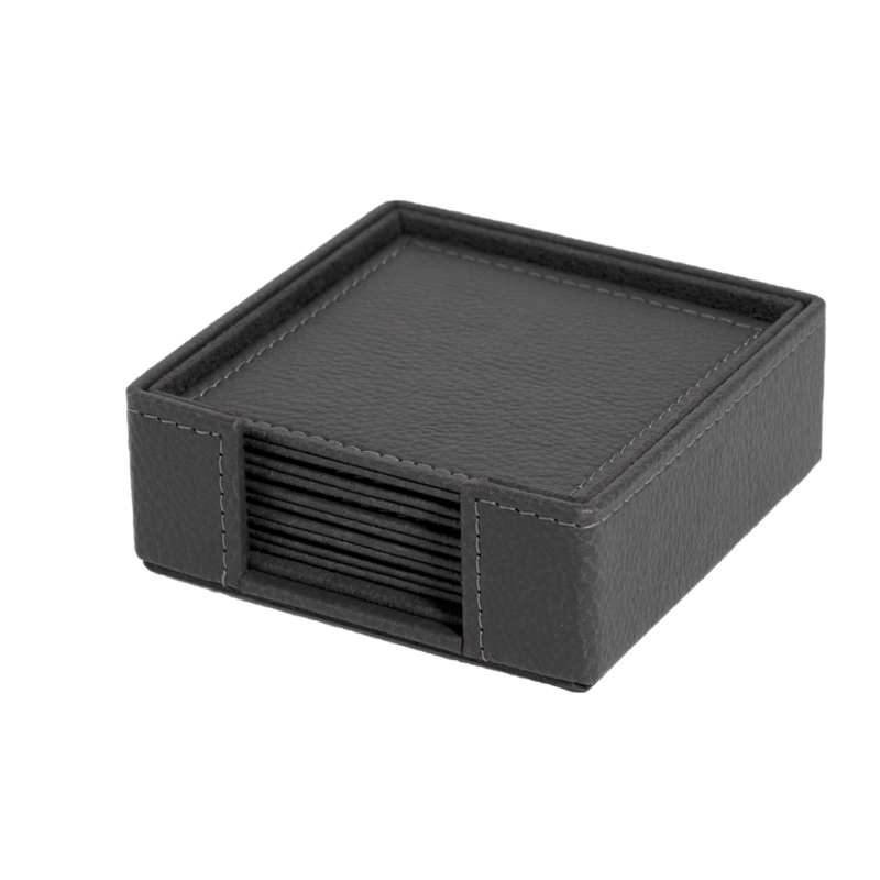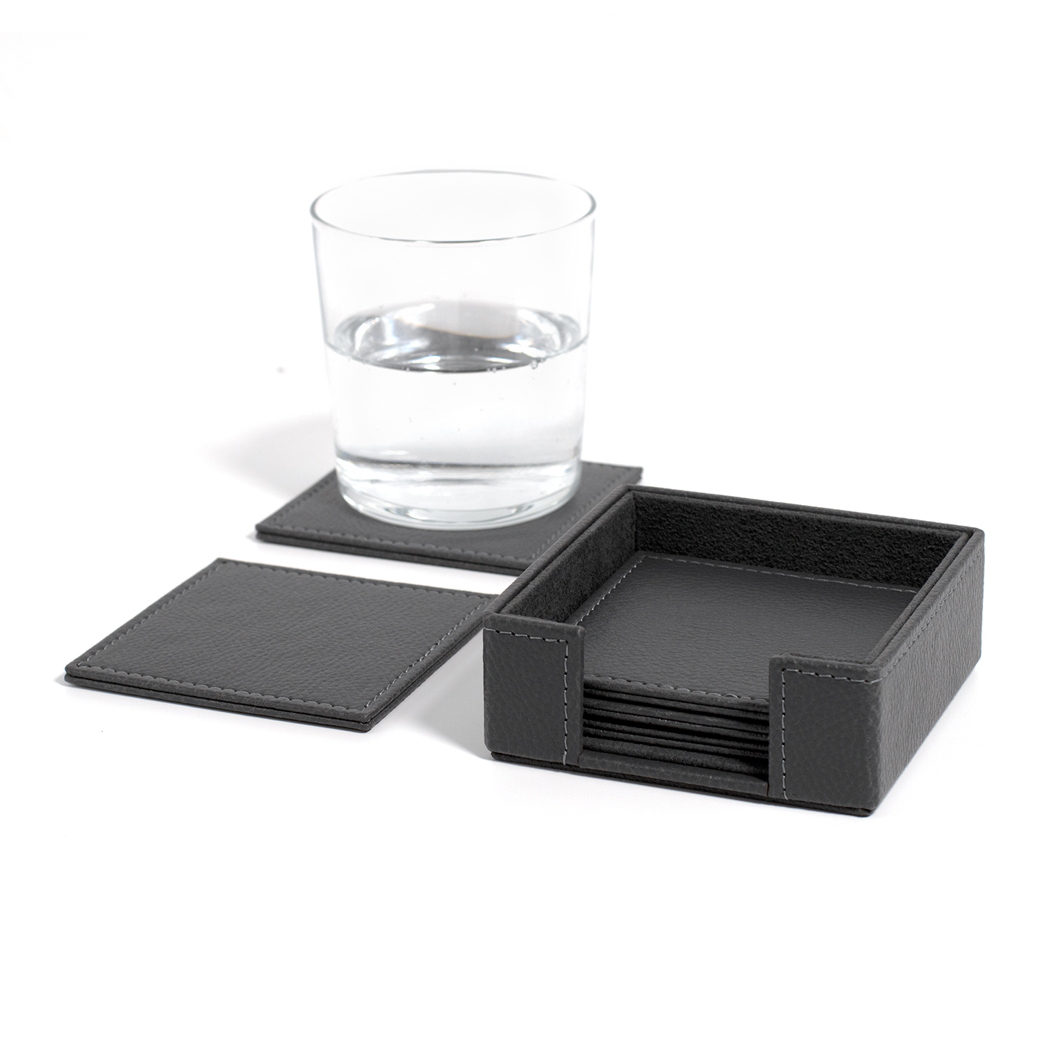 Δερμάτινο σετ σουβέρ γραφείου σε χρώμα γκρι. Περιέχει 5 σουβέρ και 1 βάση.