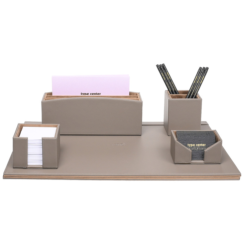 Δερμάτινο σετ γραφείου σε χρώμα γκρι. Το σετ περιλαμβάνει σουμέν (αναδιπλούμενο), φακελοστάτη, καρτοθήκη, μολυβοθήκη, χαρτοθήκη ιδίου χρώματος