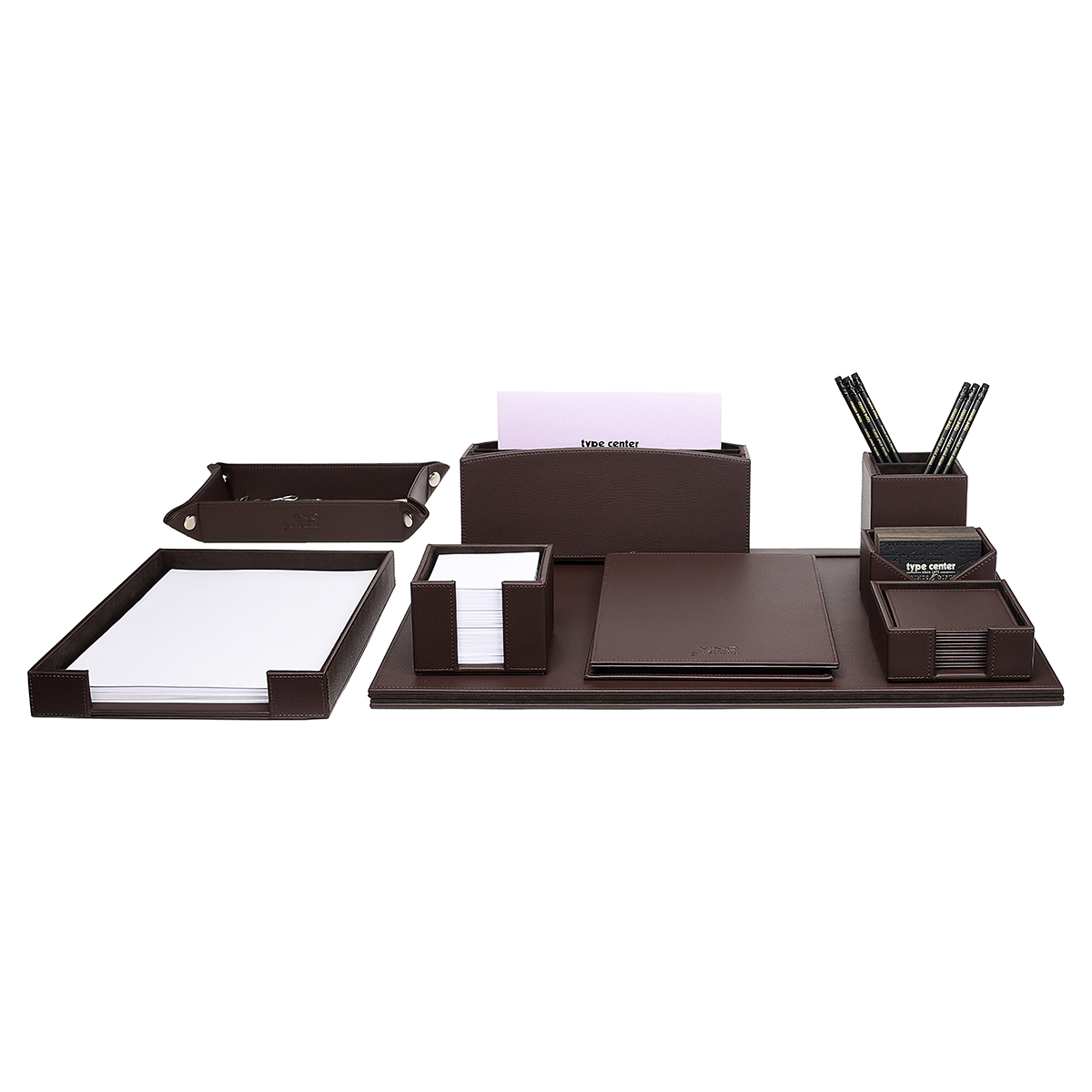 Δερμάτινο σετ γραφείου σε χρώμα καφέ. Το σετ περιλαμβάνει σουμέν (αναδιπλούμενο), φακελοστάτη, καρτοθήκη, μολυβοθήκη, χαρτοθήκη, δίσκο εισερχομένων Α4, δισκάκι, σουβέρ, μπλοκ σημειώσεων ιδίου χρώματος