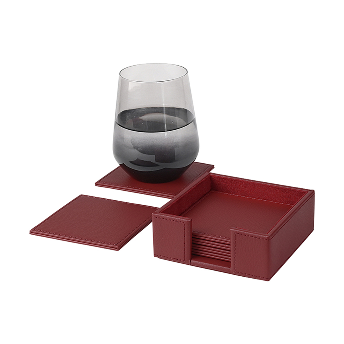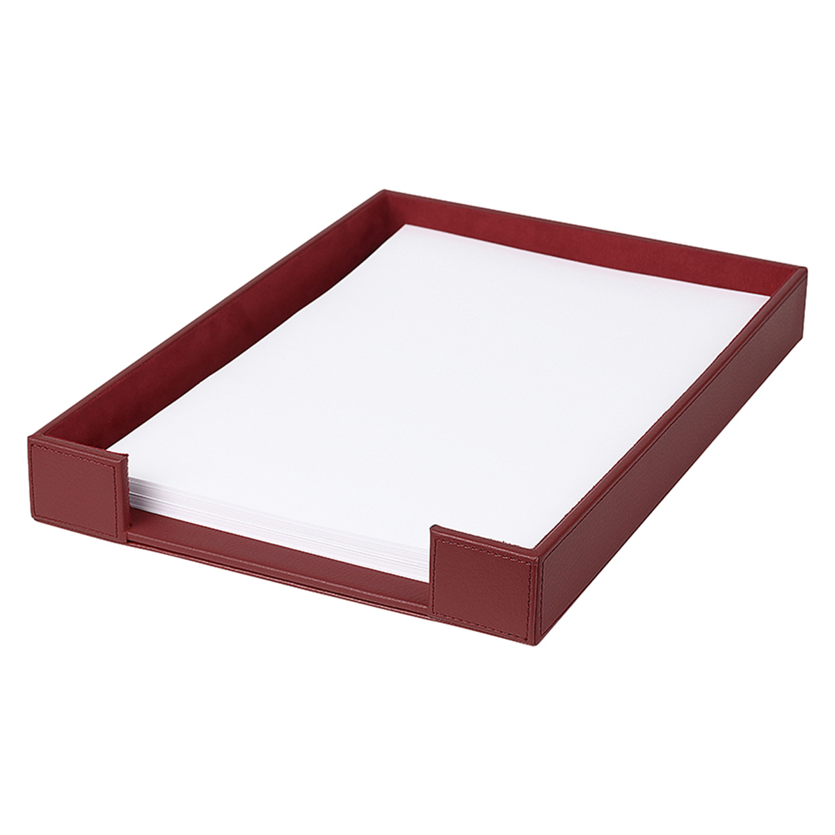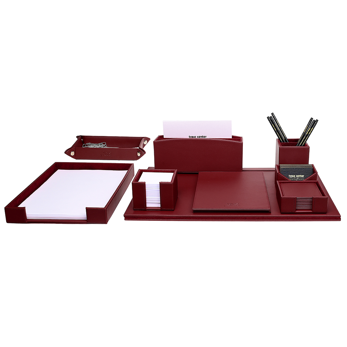 Δερμάτινο σετ γραφείου σε χρώμα μπορντό. Το σετ περιλαμβάνει σουμέν (αναδιπλούμενο), φακελοστάτη, καρτοθήκη, μολυβοθήκη, χαρτοθήκη, δίσκο εισερχομένων Α4, δισκάκι, σουβέρ, μπλοκ σημειώσεων ιδίου χρώματος