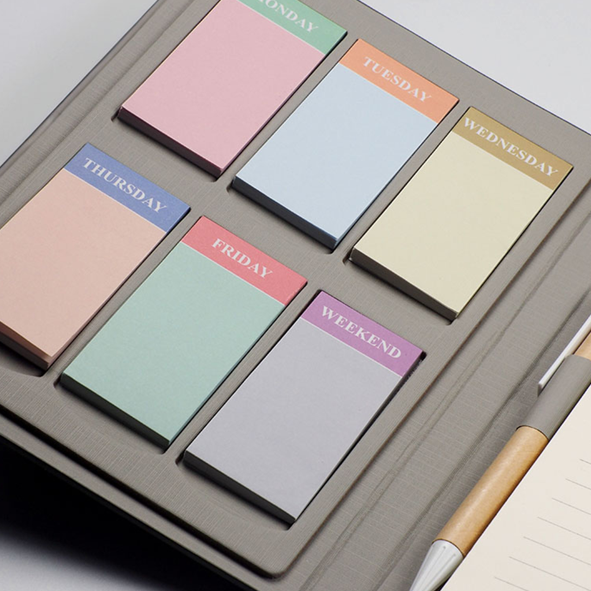 Organizer από την εταιρεία VNC σε γκρι χρώμα. Περιλαμβάνει σημειωματάριο με γραμμές, χρωματιστά sticky notes για κάθε ημέρα της εβδομάδας και eco-friendly στυλό. Η ανθεκτική εξωτερική επένδυση προσφέρει πολυτελή αίσθηση αφής, ενώ το μαγνητικό κλείσιμο εξασφαλίζει ασφάλεια στις μετακινήσεις σας.