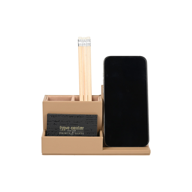 Δερμάτινη μολυβοθήκη και βάση κινητού από την εταιρεία VNC σε χρώμα μπεζ. Κατασκευασμένη από υψηλής ποιότητας δέρμα, διαθέτει μαλακή υφασμάτινη εσωτερική επένδυση προσφέροντας αντοχή και κομψότητα, καθιστώντας το γραφείο τακτοποιημένο και λειτουργικό. Αυτό το αξεσουάρ γραφείου είναι ιδανική για να οργανώνει στυλό, μολύβια ενώ παράλληλα παρέχει ένα ενσωματωμένο stand για το κινητό τηλέφωνο.