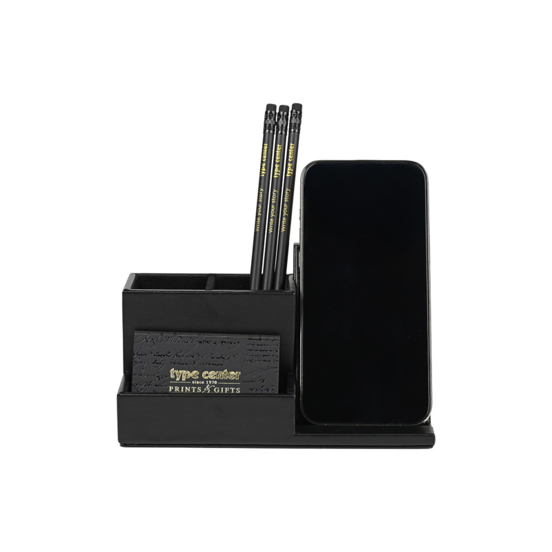 Δερμάτινη μολυβοθήκη και βάση κινητού από την εταιρεία VNC σε χρώμα μαύρο. Κατασκευασμένη από υψηλής ποιότητας δέρμα, διαθέτει μαλακή υφασμάτινη εσωτερική επένδυση προσφέροντας αντοχή και κομψότητα, καθιστώντας το γραφείο τακτοποιημένο και λειτουργικό. Αυτό το αξεσουάρ γραφείου είναι ιδανική για να οργανώνει στυλό, μολύβια ενώ παράλληλα παρέχει ένα ενσωματωμένο stand για το κινητό τηλέφωνο.