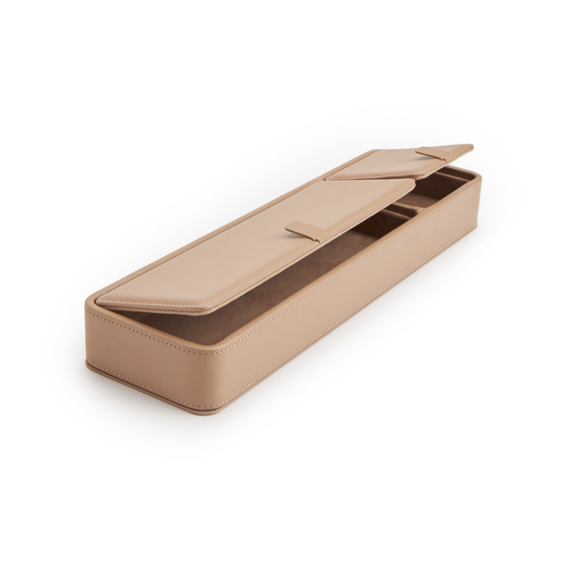 - Θήκη αποθήκευσης: Η θήκη διαθέτει καπάκι που ανοίγει και αποκαλύπτει δύο εσωτερικά χωρίσματα, τα οποία είναι ιδανικά για την οργάνωση μικρών αντικειμένων όπως στυλό, μολύβια, συνδετήρες ή άλλα γραφικά εργαλεία. Το καπάκι προσφέρει επιπλέον προστασία και διατηρεί τα αντικείμενα σας κρυφά και τακτοποιημένα.