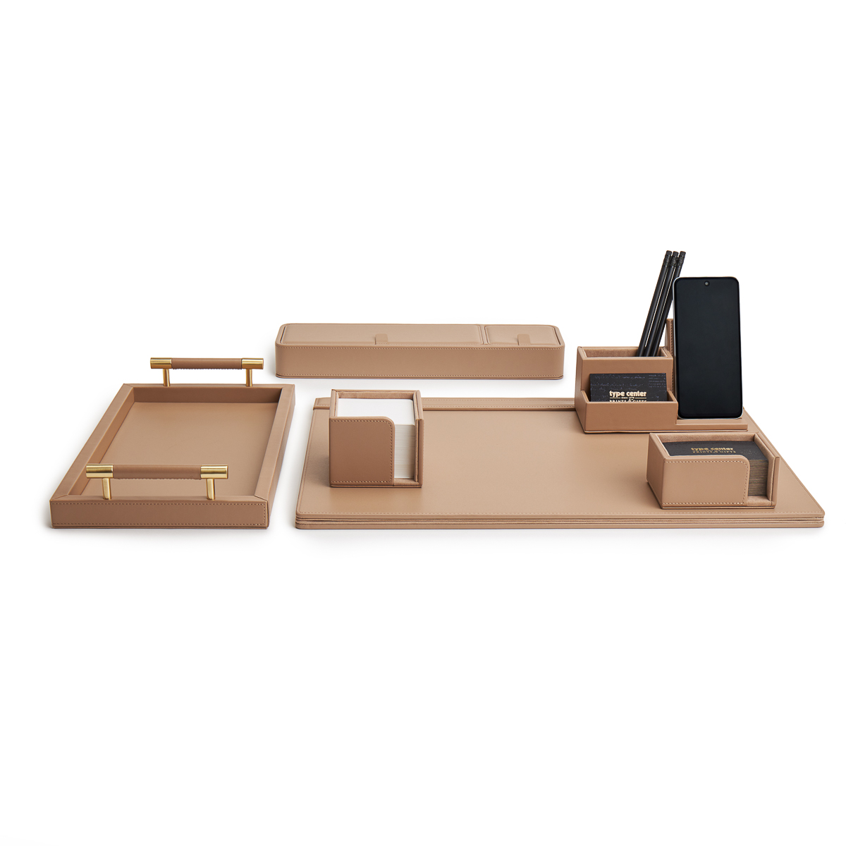 Δερμάτινο σετ γραφείου σε μπεζ χρώμα αποτελείται από έξι κομμάτια, όλα φτιαγμένα με προσοχή στη λεπτομέρεια και σχεδιασμένα για να προσφέρουν λειτουργικότητα και κομψότητα στο γραφείο. Αναλυτικά περιλαμβάνει: