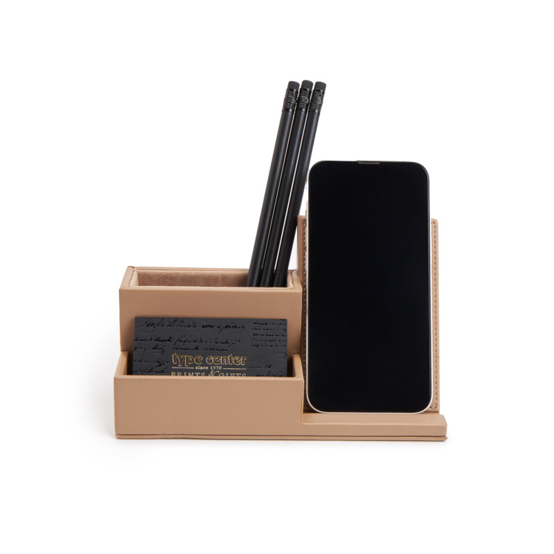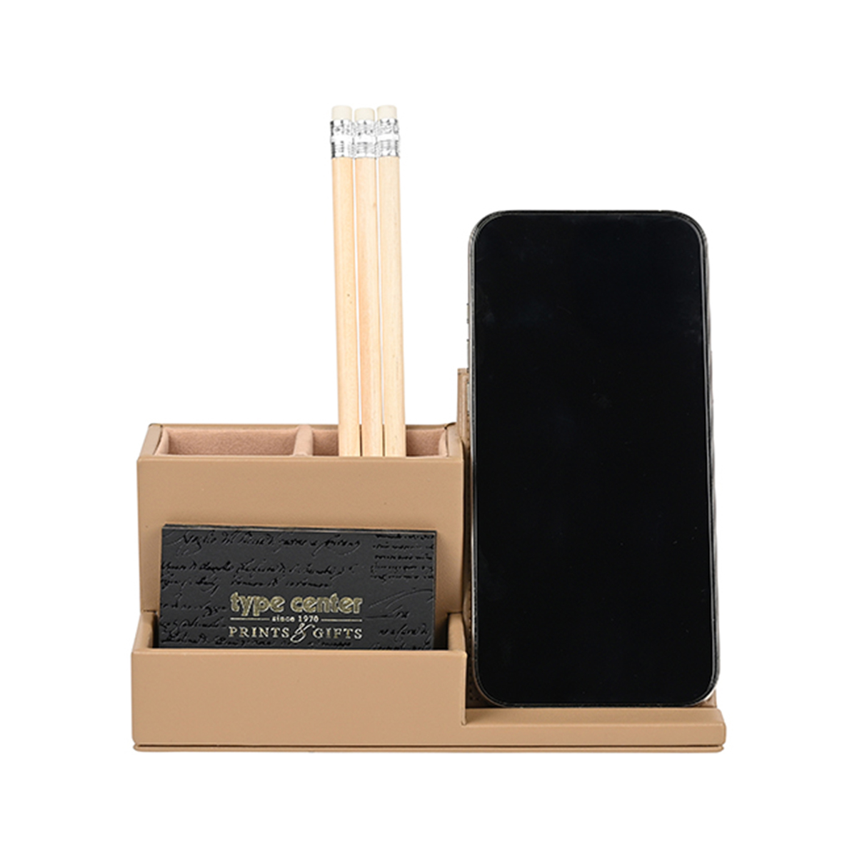 - Θήκη για μολύβια/στυλό και βάση κινητού τηλεφώνου: Κομψή θήκη που κρατά τα εργαλεία γραφής σας οργανωμένα και σε κοντινή απόσταση και ειδικός χώρος για την ασφαλή τοποθέτηση του κινητού τηλεφώνου σας, ώστε να είναι πάντα σε κοντινή απόσταση και ορατό.